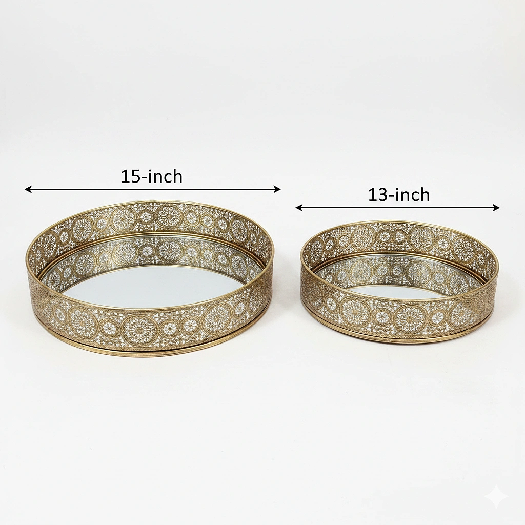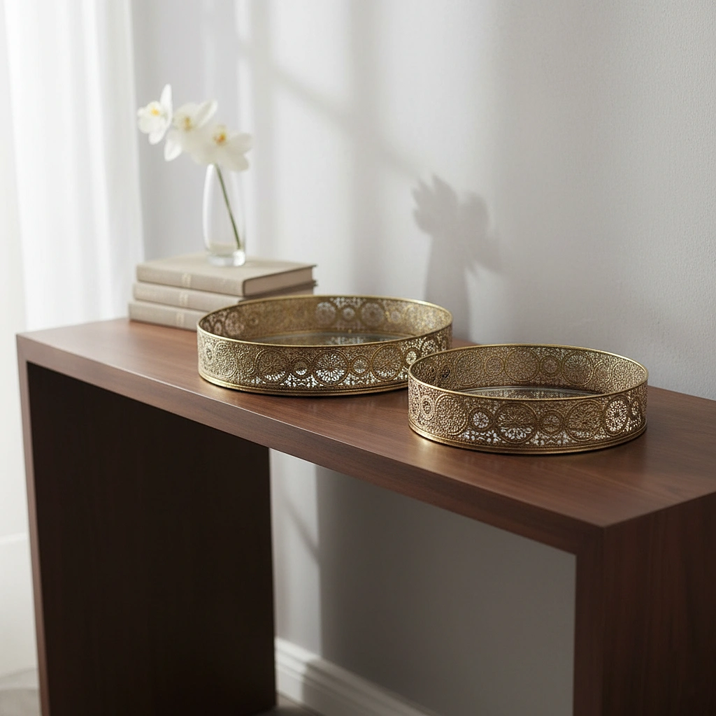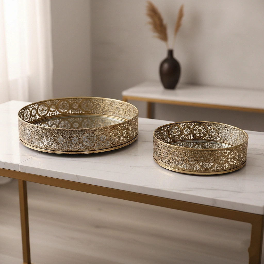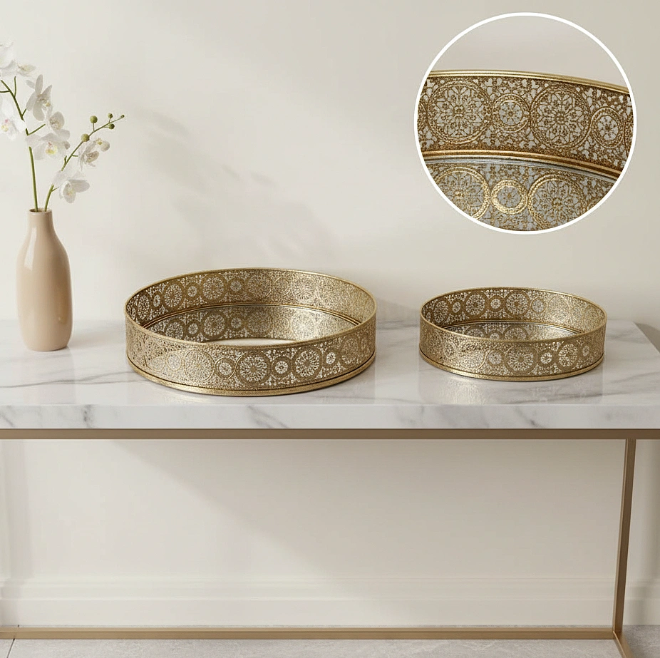 Each tray features a masterfully crafted, laser-cut metal gallery wall, boasting an intricate lace-like filigree pattern. Finished in a luminous, brushed antique gold, the delicate circular motifs create a captivating play of light and shadow, casting ethereal reflections across your surfaces. The high-clarity mirrored base serves as a radiant stage, reflecting the beauty of whatever it holds—from artisanal candles and crystal perfume carafes to your most precious jewelry.