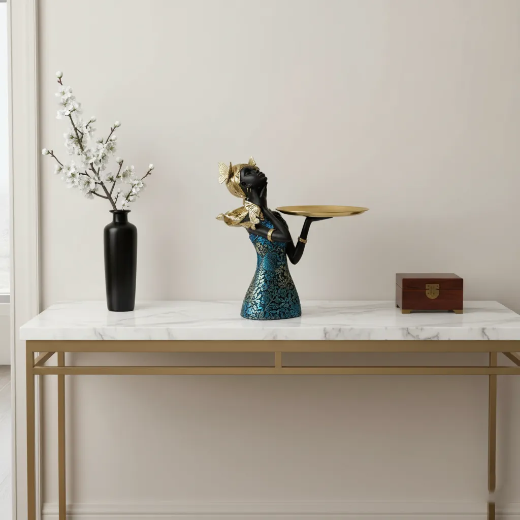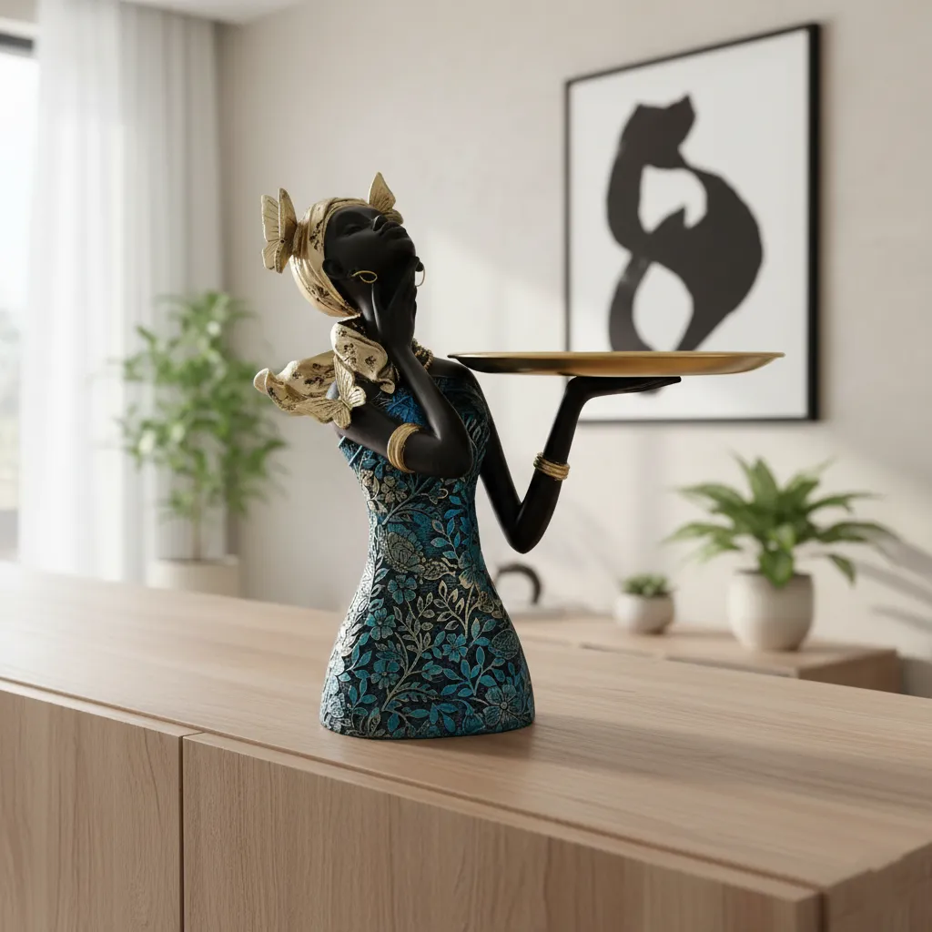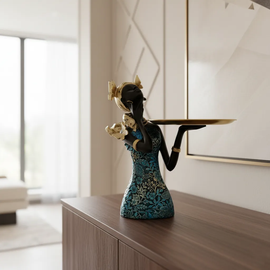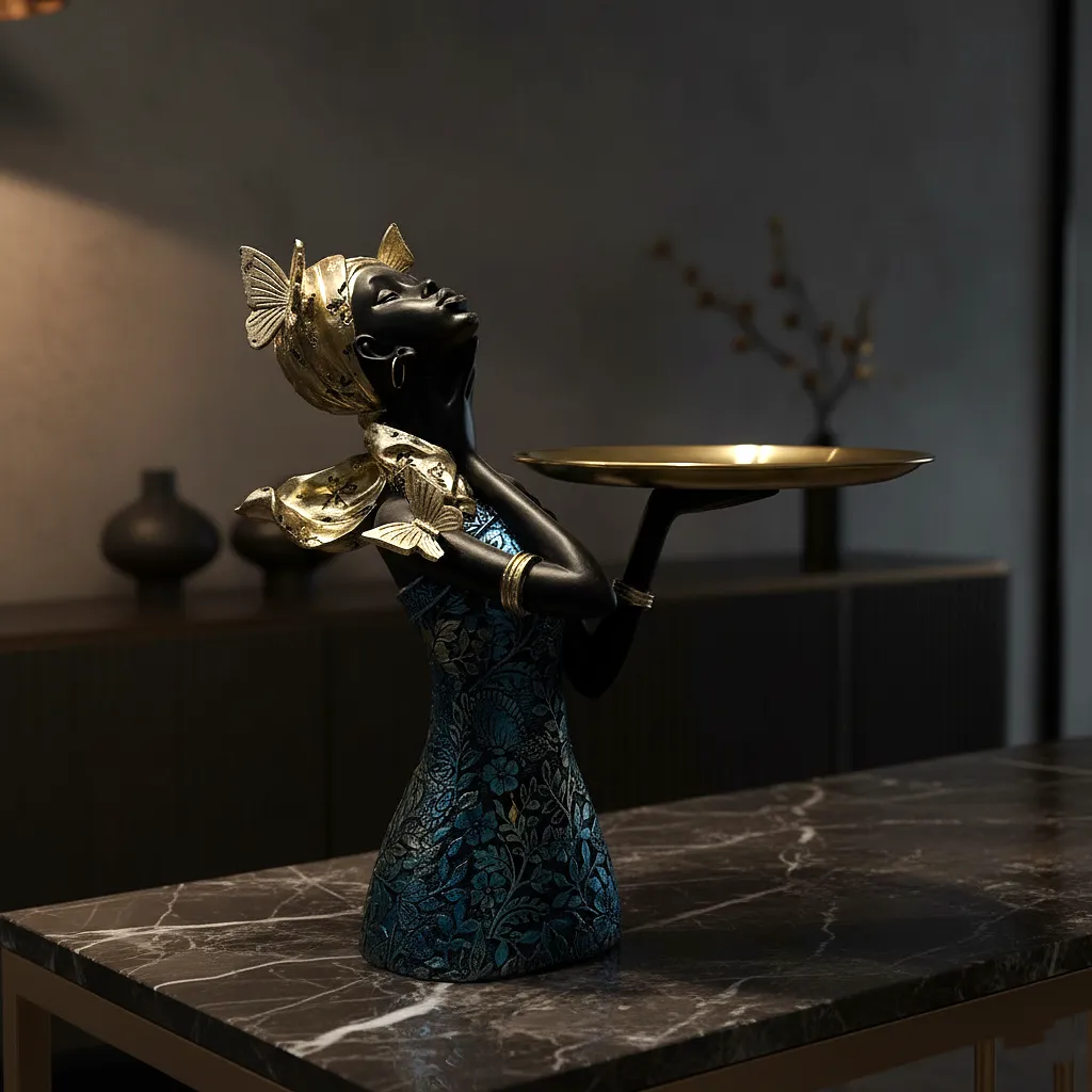A bold expression of modern luxury and cultural elegance, the Aurelia Noir Crown Bowl is designed to captivate. Sculpted in a smooth matte-black finish, the serene feminine form is adorned with a richly textured gold headwrap, crowned by a sleek metallic dish. Delicate gold accents and statement earrings elevate its regal presence. Perfect for holding tealights, jewelry, or simply standing as an art object, this piece brings refined drama to console tables, vanities, and curated living spaces. An unmistakable accent for interiors that embrace sophistication and artistic depth.