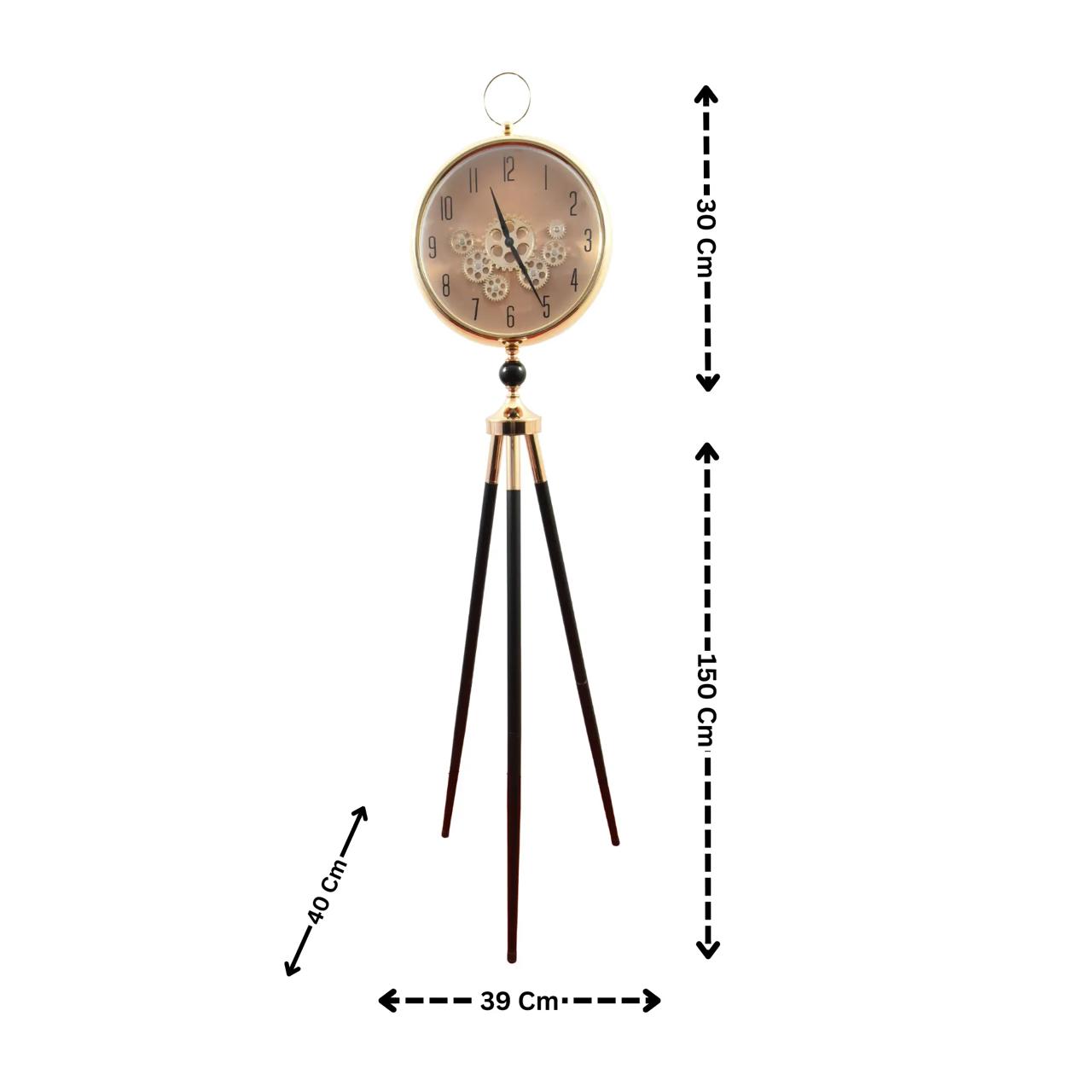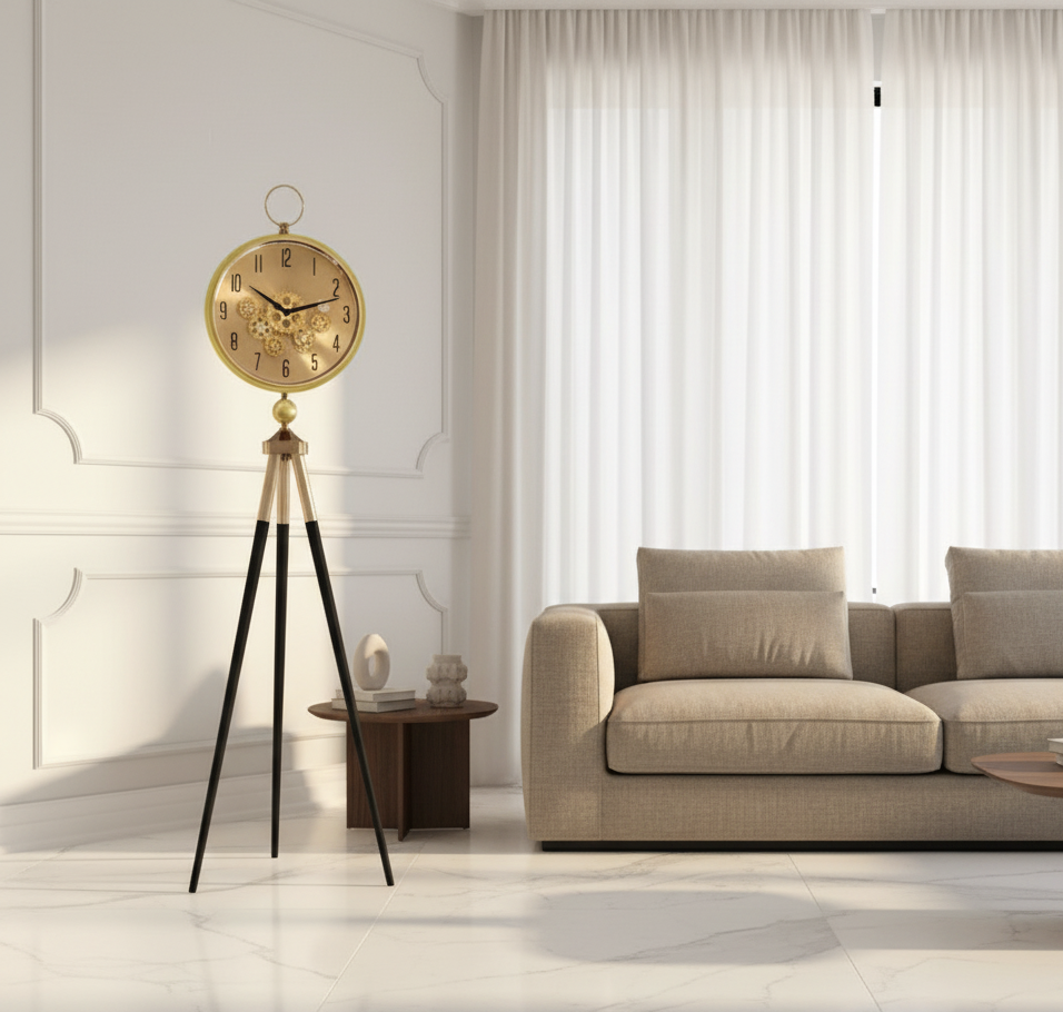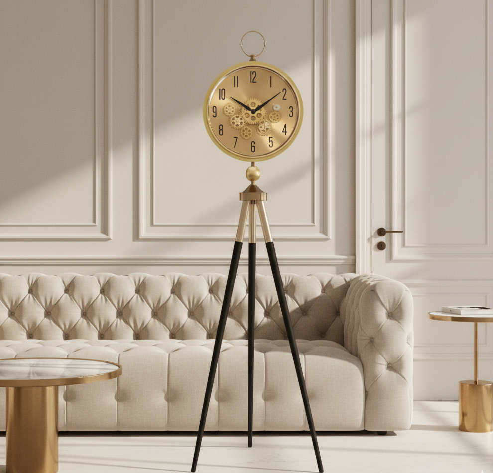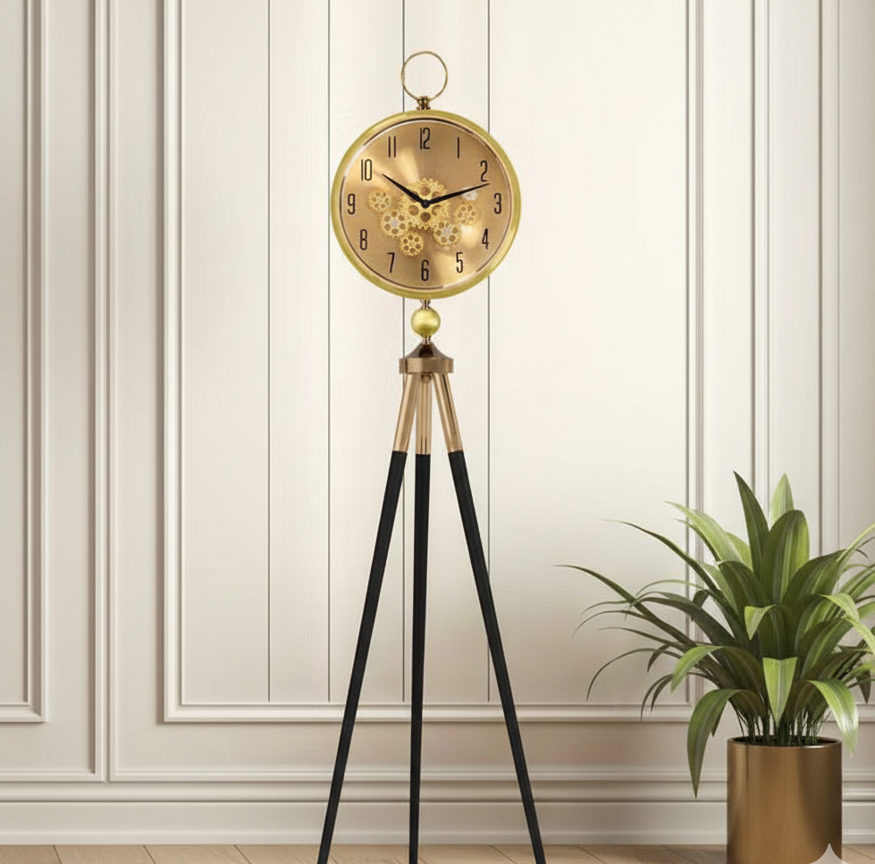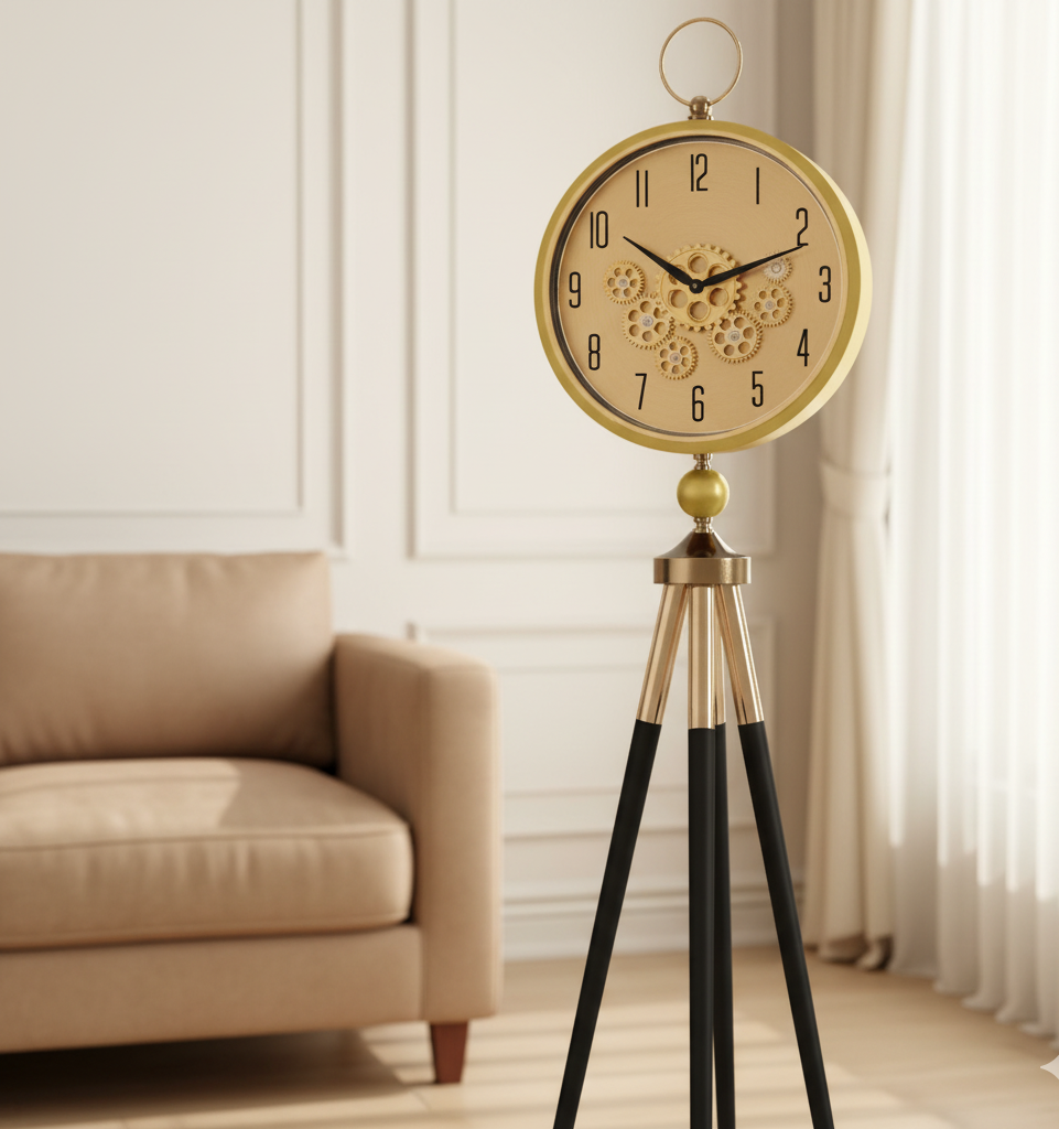 The Aurelius Chrona Grand Floor Clock is a masterwork of modern horology, blending sculptural elegance with mechanical artistry. Its luminous gold dial reveals intricate gear detailing, balanced atop a refined black tripod base for a commanding yet graceful presence.