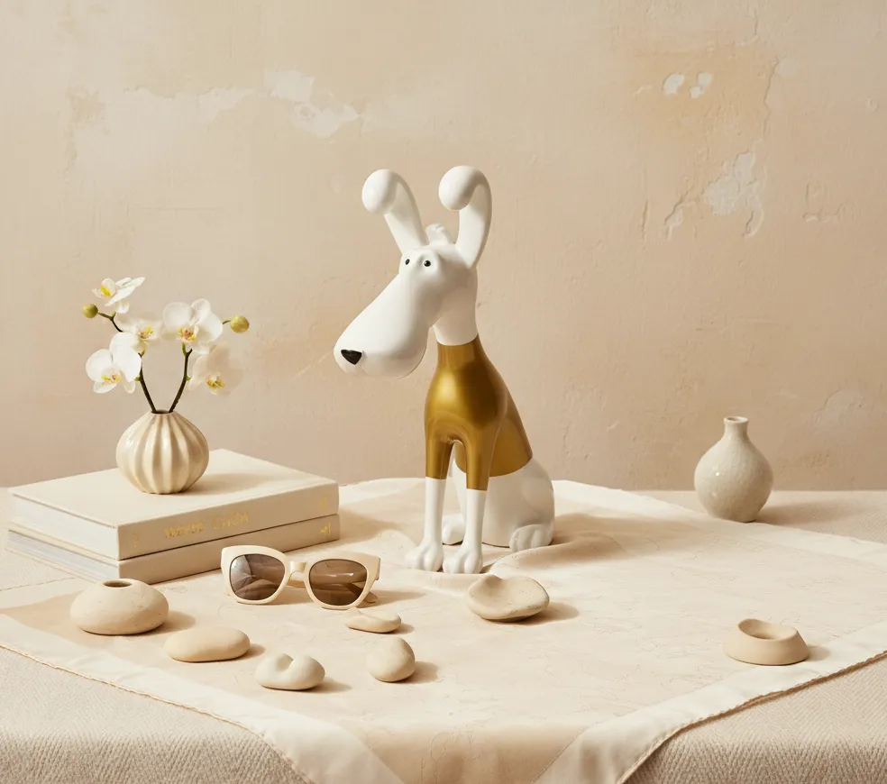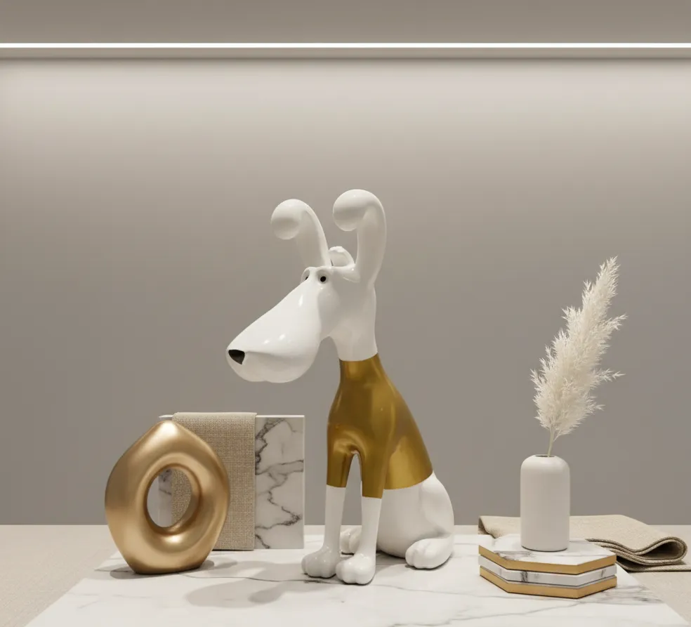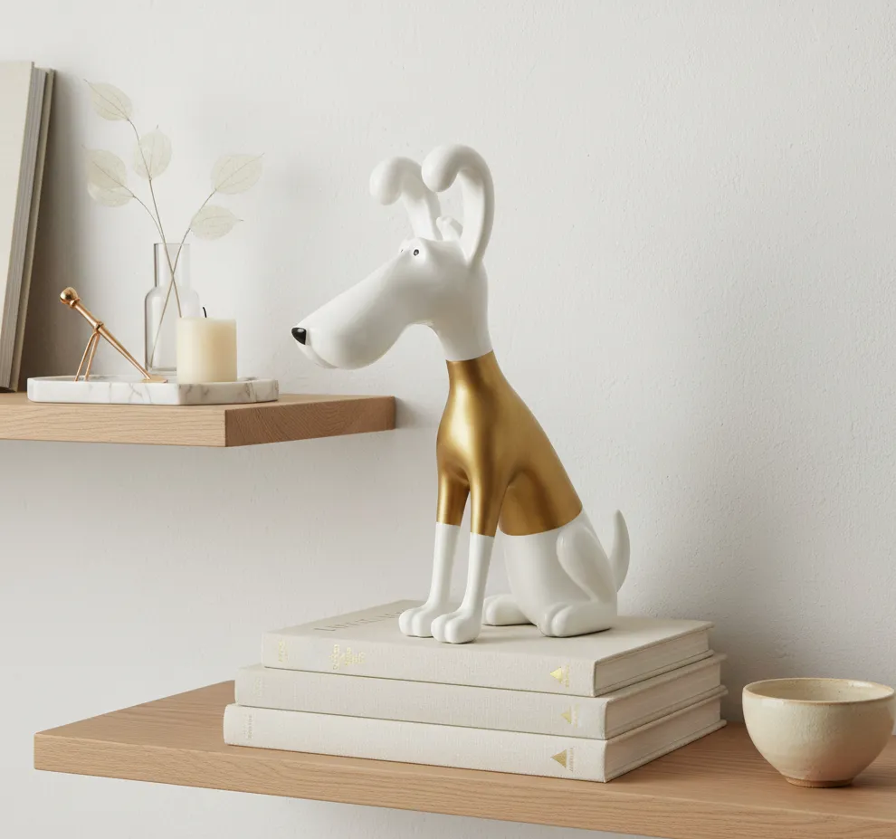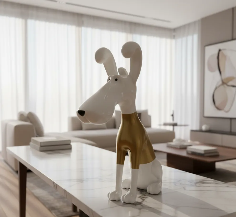 Aurelius Hound is a contemporary art sculpture that blends playful character with refined luxury. Finished in pristine white with warm metallic gold accents, this piece brings charm and sophistication into modern interiors, making it a statement object for curated spaces.