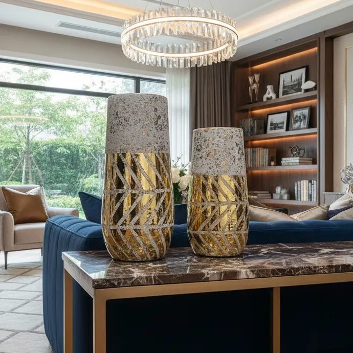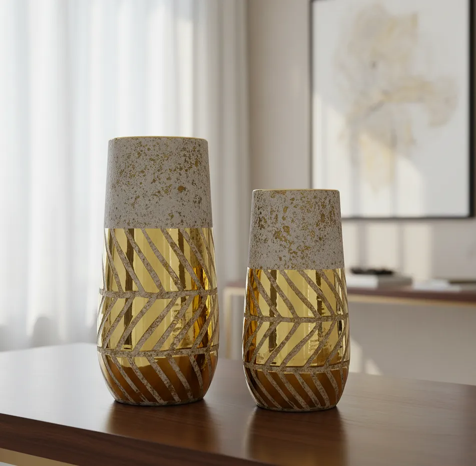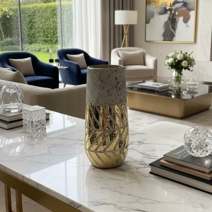 Experience the epitome of elegance with the Aurum Duo Vases. These stunning, handcrafted vases boast a sophisticated blend of distressed silver and gleaming gold accents, creating a striking visual contrast. Perfect for adding a touch of luxury to any decor, these vases feature a unique diagonal pattern that catches the light, elevating your space with refined beauty. Ideal for displaying fresh flowers or as standalone art pieces, the Aurum Duo Vases bring a sense of opulence and style to your home.