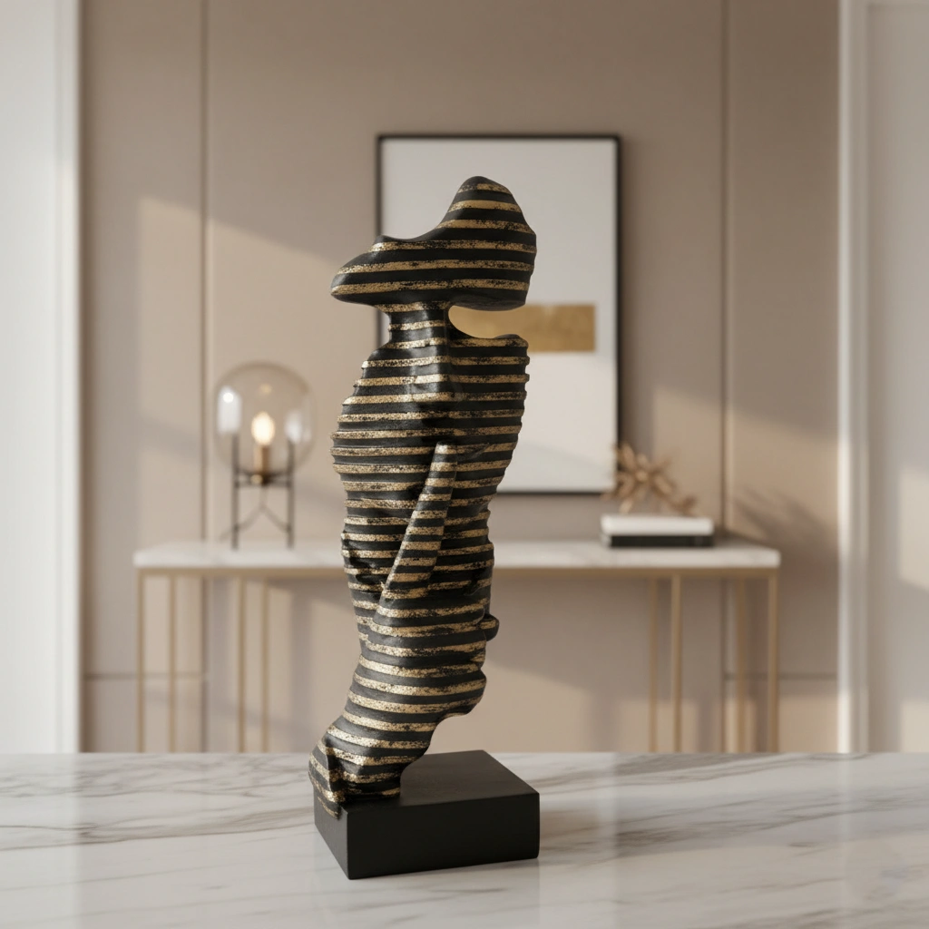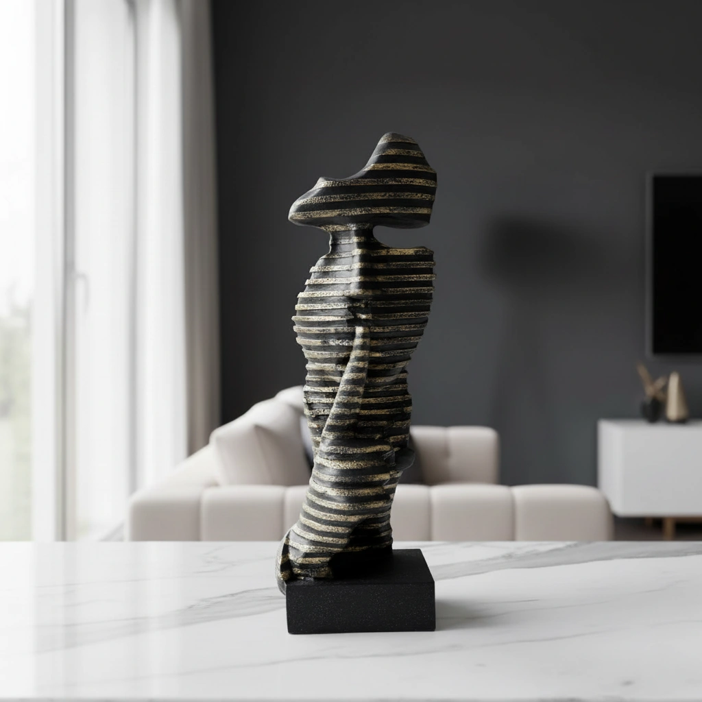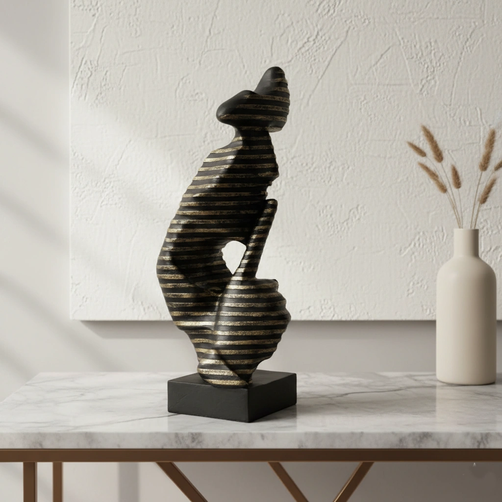 Bold, enigmatic, and sculpturally fluid, the Eclipse Silhouette is a contemporary art piece that celebrates form through rhythm and shadow. Carved in layered contours with a deep black finish, subtly brushed with antique gold highlights, this abstract human figure evokes movement, mystery, and quiet strength. The striated design creates a hypnotic play of light, making it visually dynamic from every angle. Perfect as a luxe accent for modern interiors, art-led spaces, or statement consoles, this sculpture adds depth, intrigue, and gallery-level sophistication to any setting.