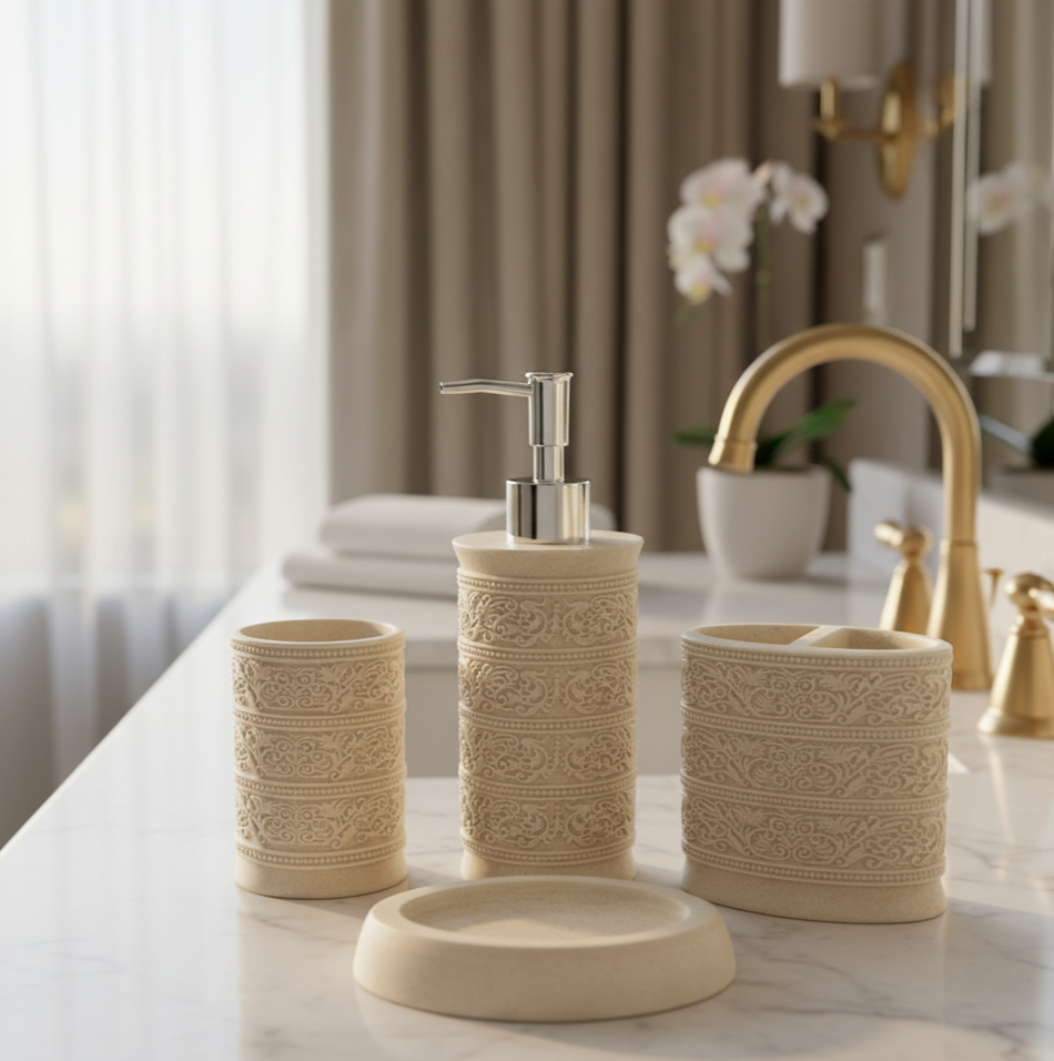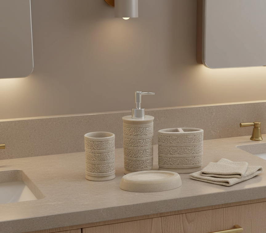 Includes matching soap dispenser, tumbler, toothbrush holder, and soap dish—designed for visual harmony and functional balance. -