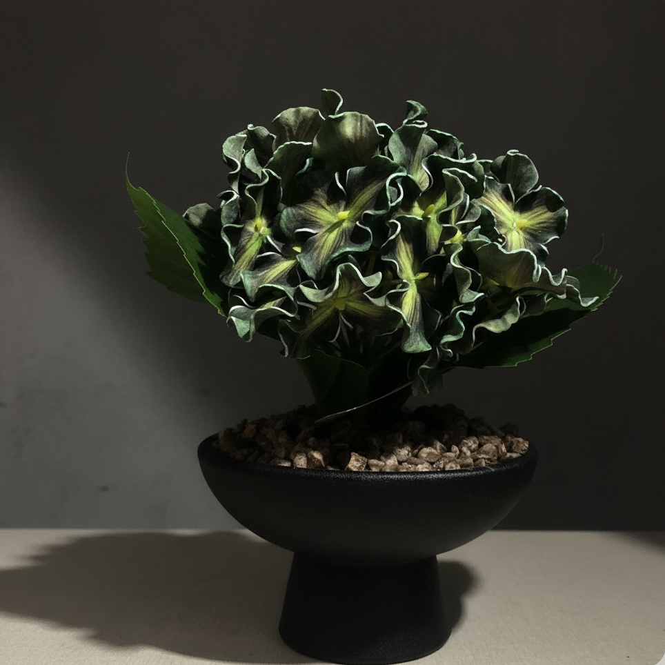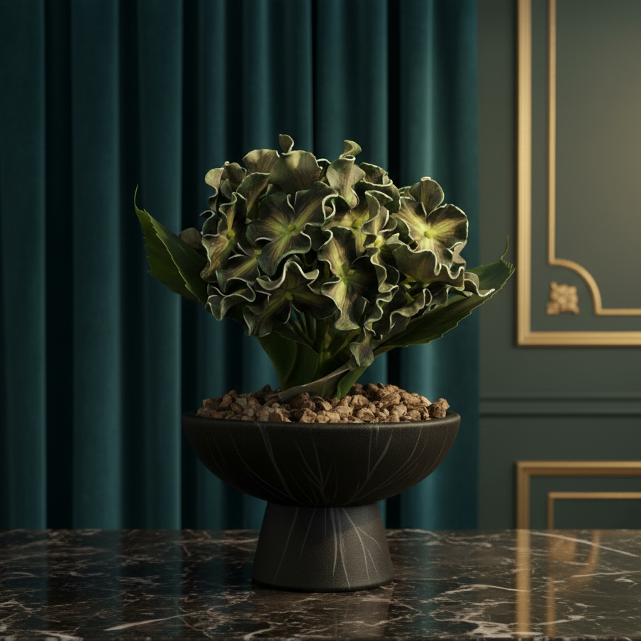 The Opulent Green Bloom Accent Piece is a statement of refined elegance, crafted to elevate any interior with its sculpted beauty. Featuring lush, ruffled green blooms enriched with soft lime undertones, each petal showcases an exquisite depth that feels both artistic and naturally striking. The arrangement sits gracefully in a matte black pedestal planter, complemented by a bed of premium stone pebbles that add earthy sophistication.