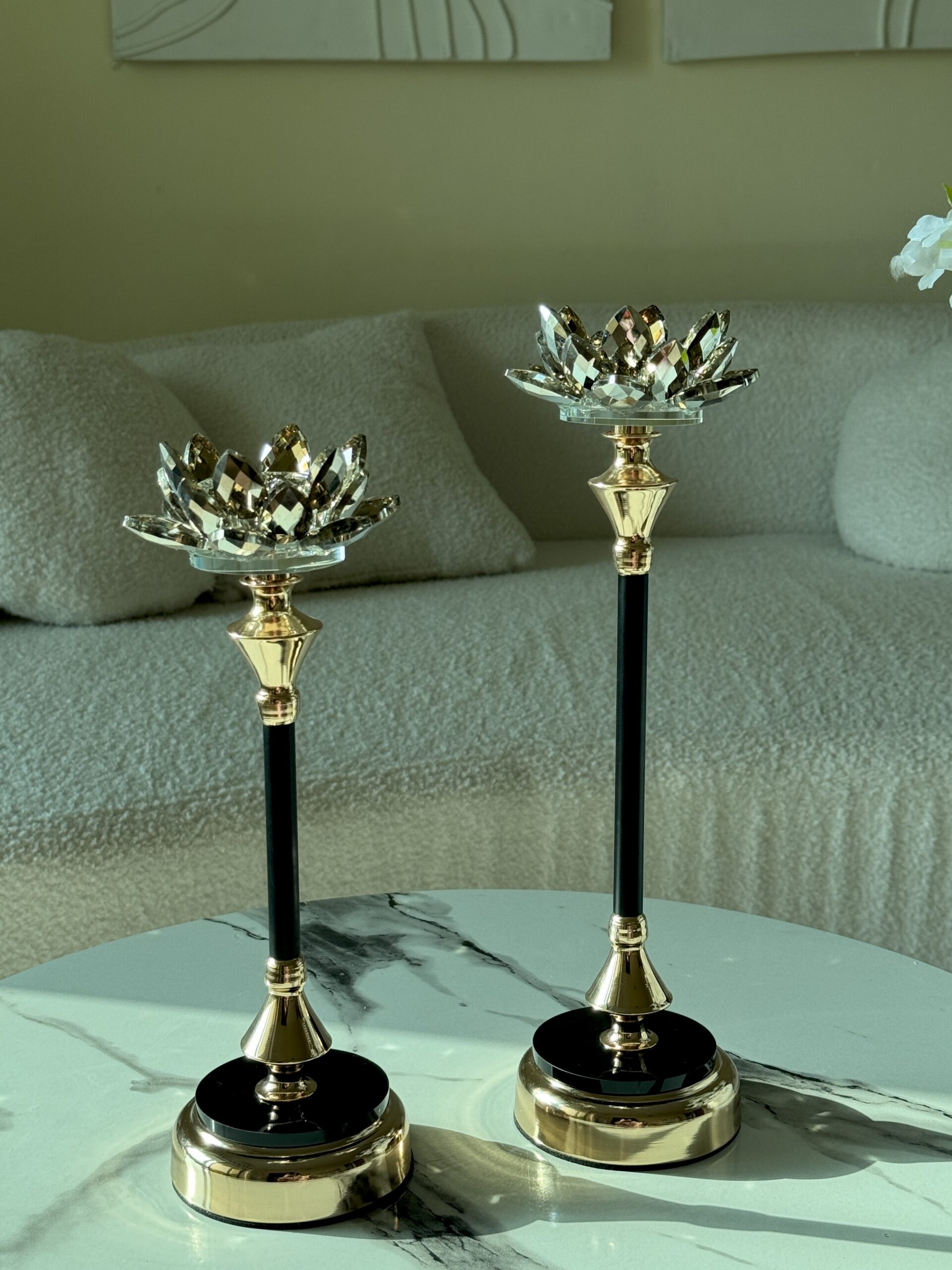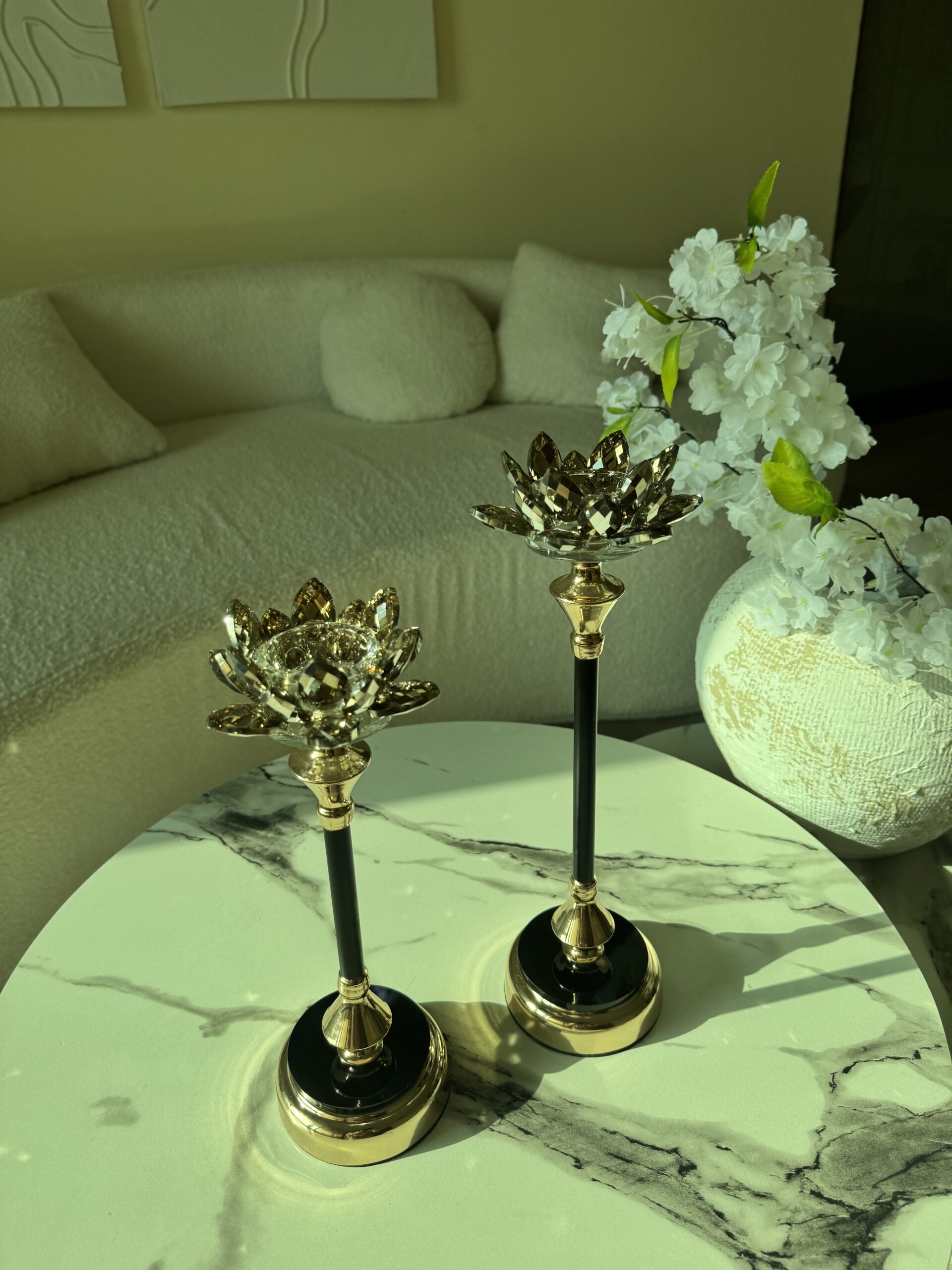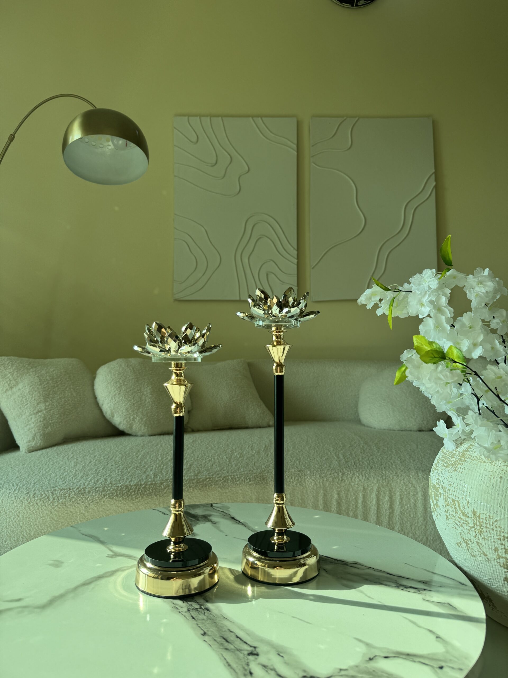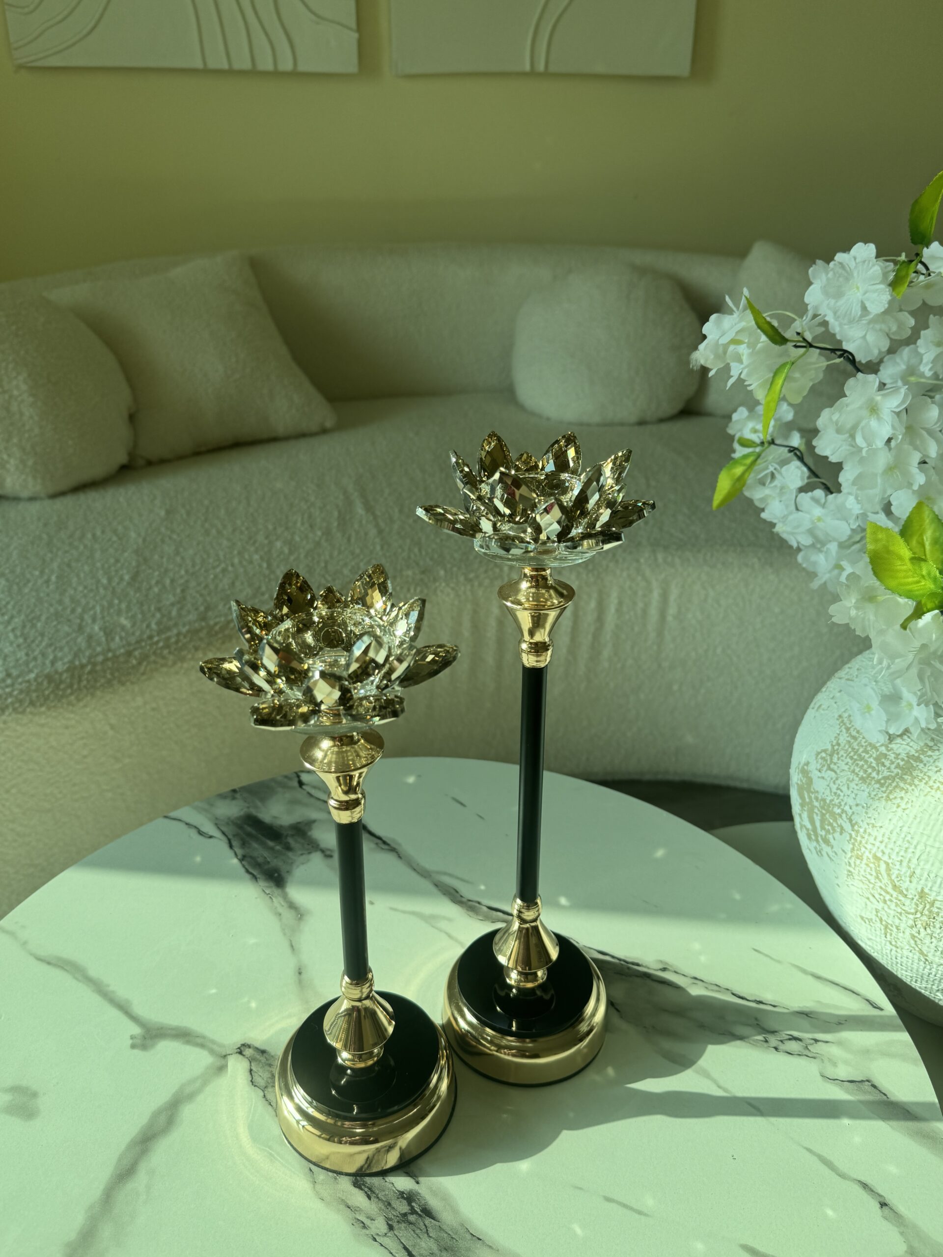 Our Eterna Lotus Candle Holders combine golden radiance, crystal lotus petals, and sleek black detailing to create a masterpiece of modern luxury.
