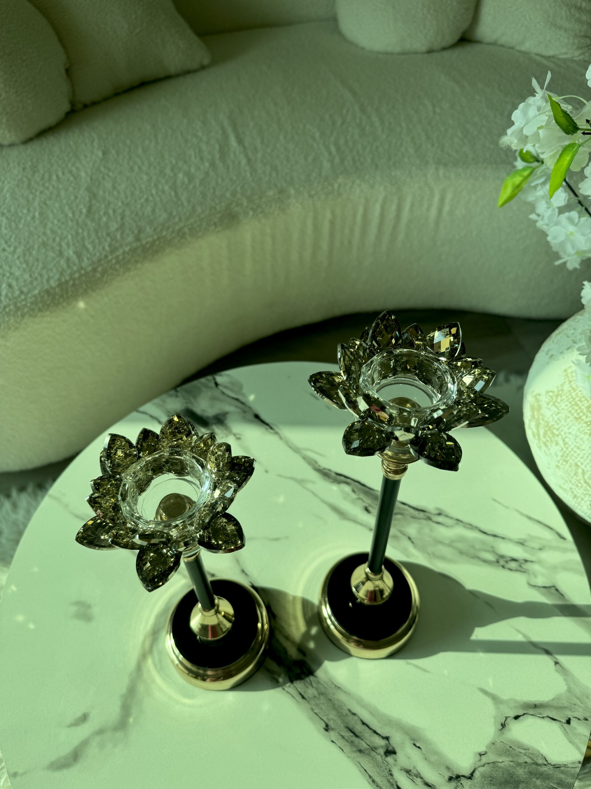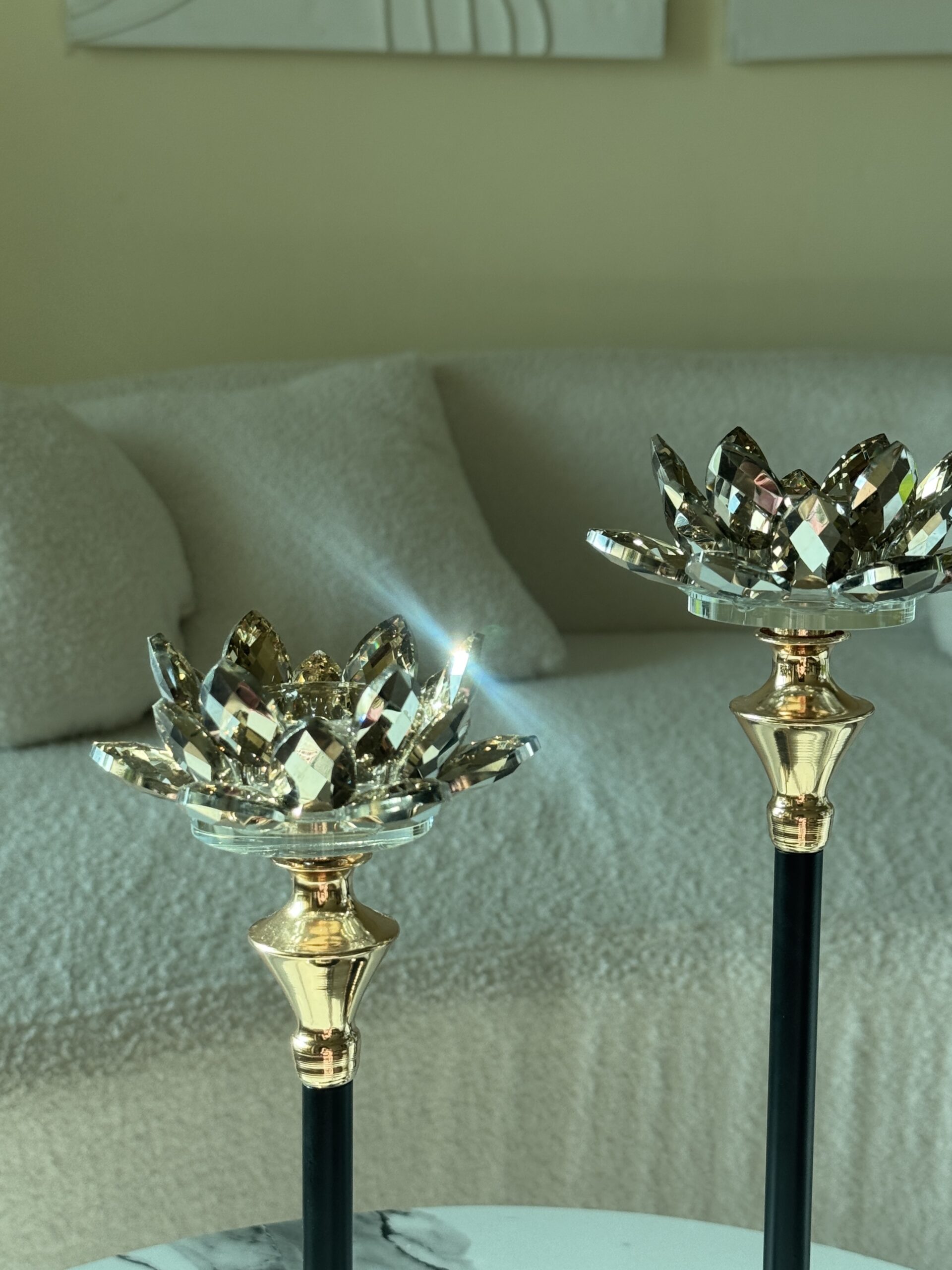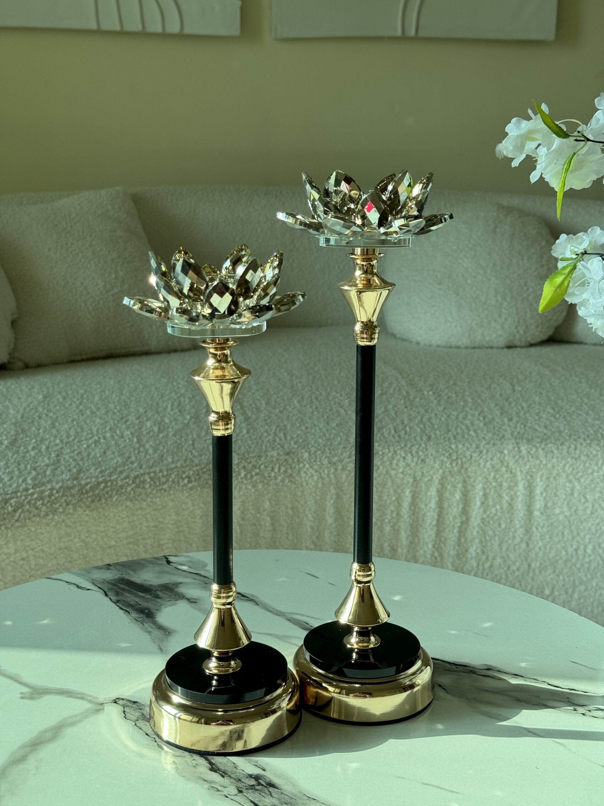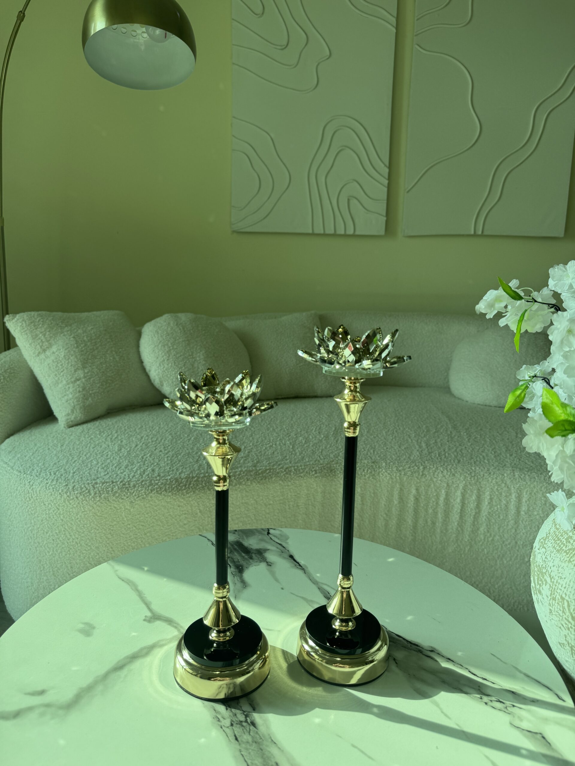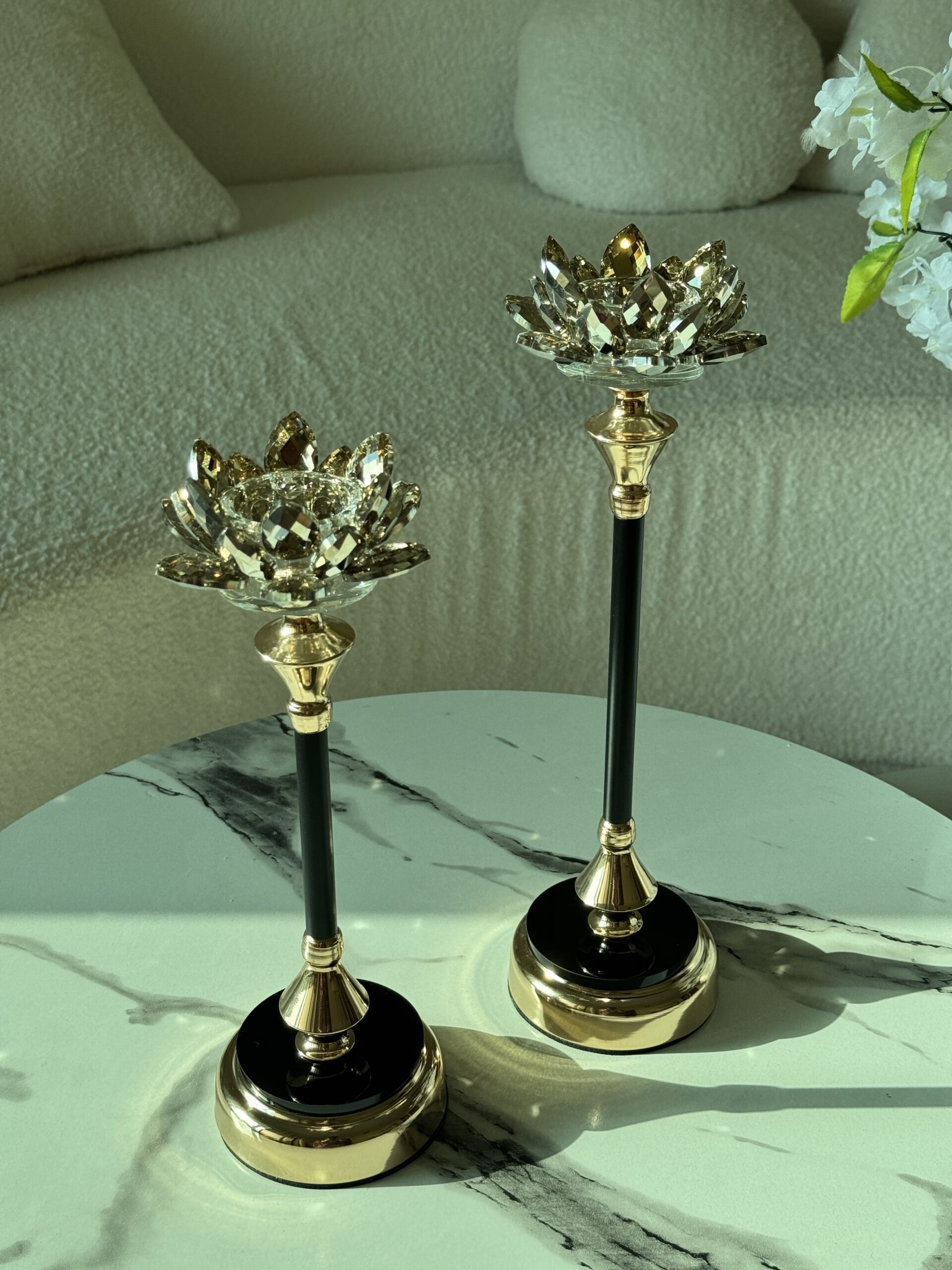 Our Eterna Lotus Candle Holders combine golden radiance, crystal lotus petals, and sleek black detailing to create a masterpiece of modern luxury.