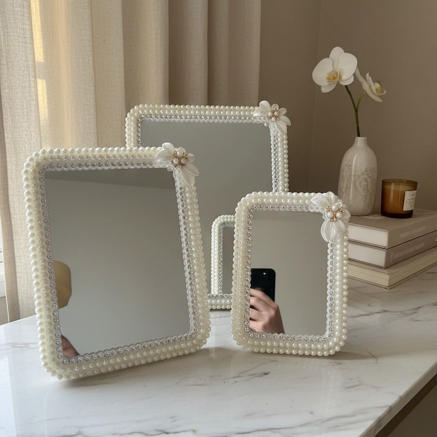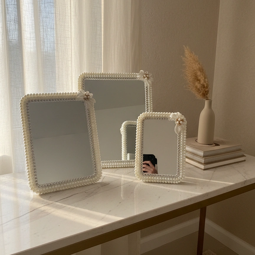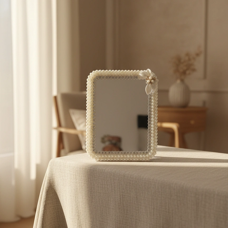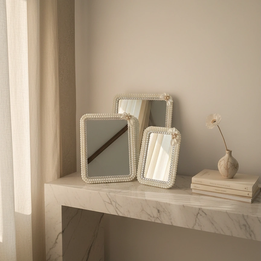 Bathed in a soft, luminous glow, the Lumière Pearl Vanity Mirrors embody quiet luxury. Framed with intricate pearl detailing and subtle floral embellishments, these mirrors bring a refined charm to your vanity or décor setting—where beauty meets serenity.