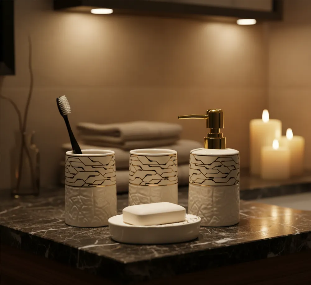 Includes soap dispenser, toothbrush holder, tumbler & soap dish