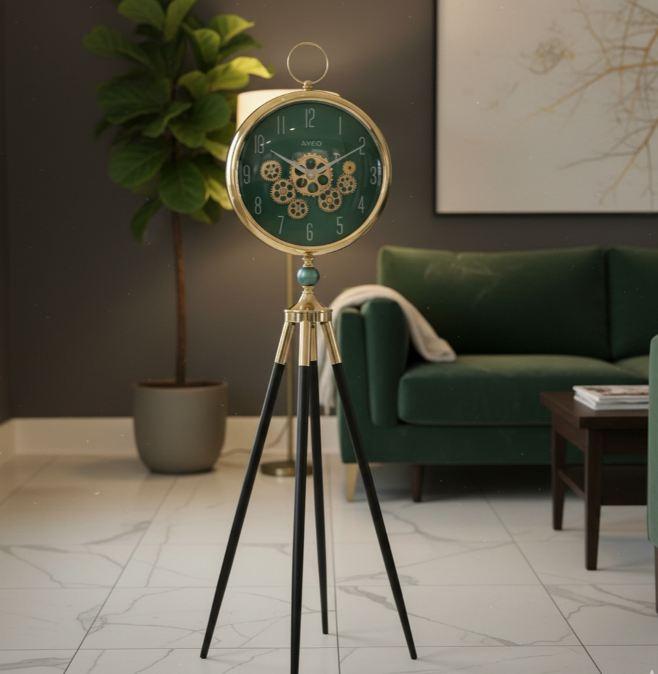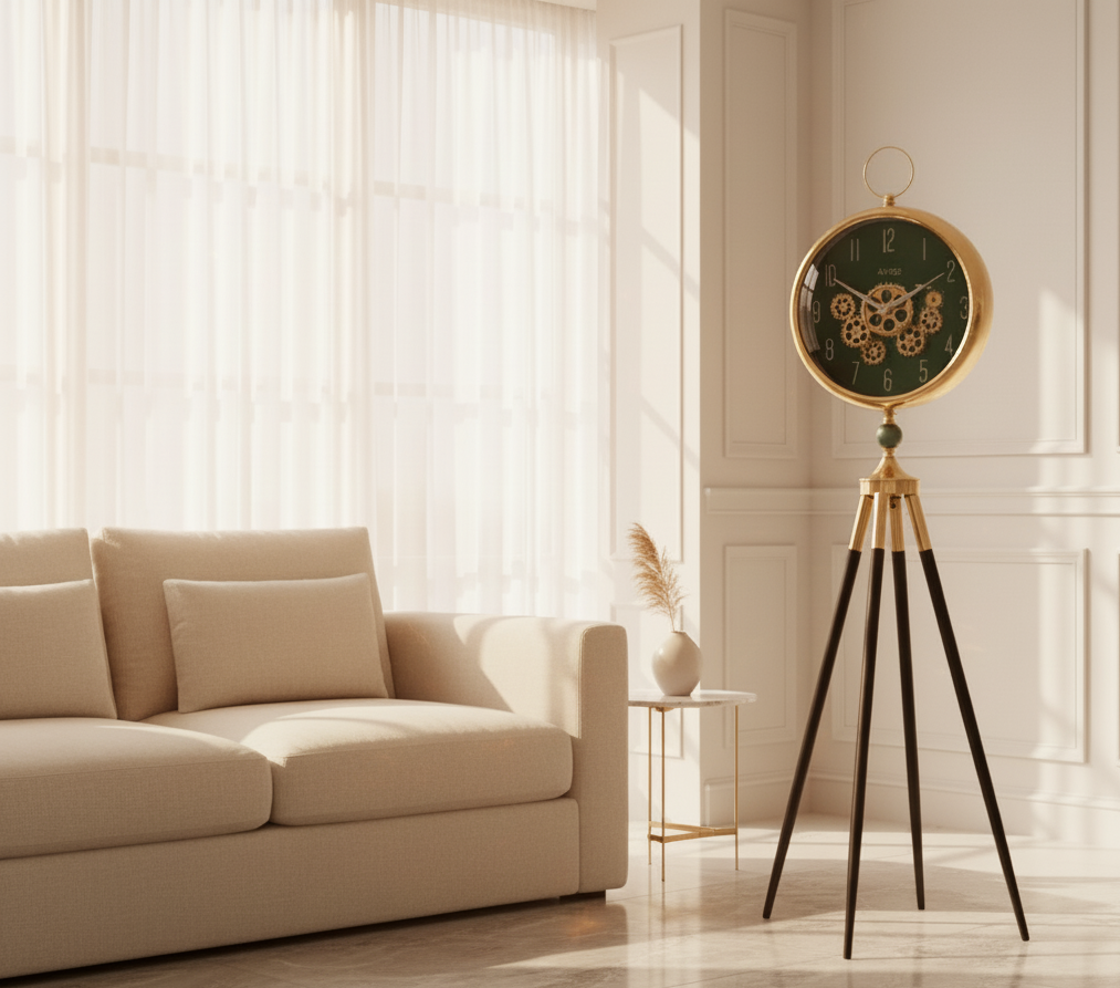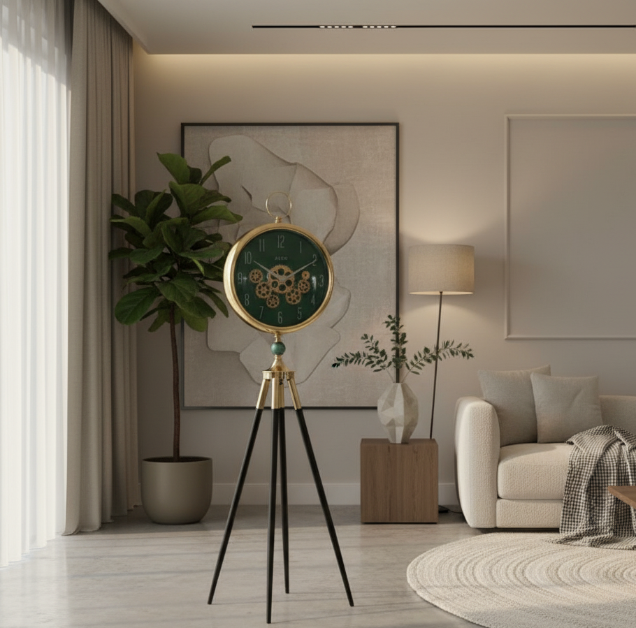 Bold yet elegant, the Regalia Nocturne Gold Tripod Clock commands attention through contrast—luminous gold against deep black structural lines. Designed as functional art, it elevates luxury interiors with dramatic refinement.