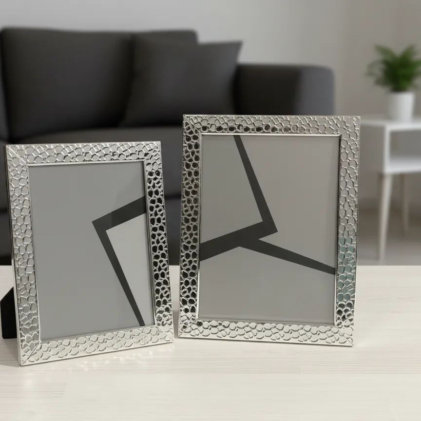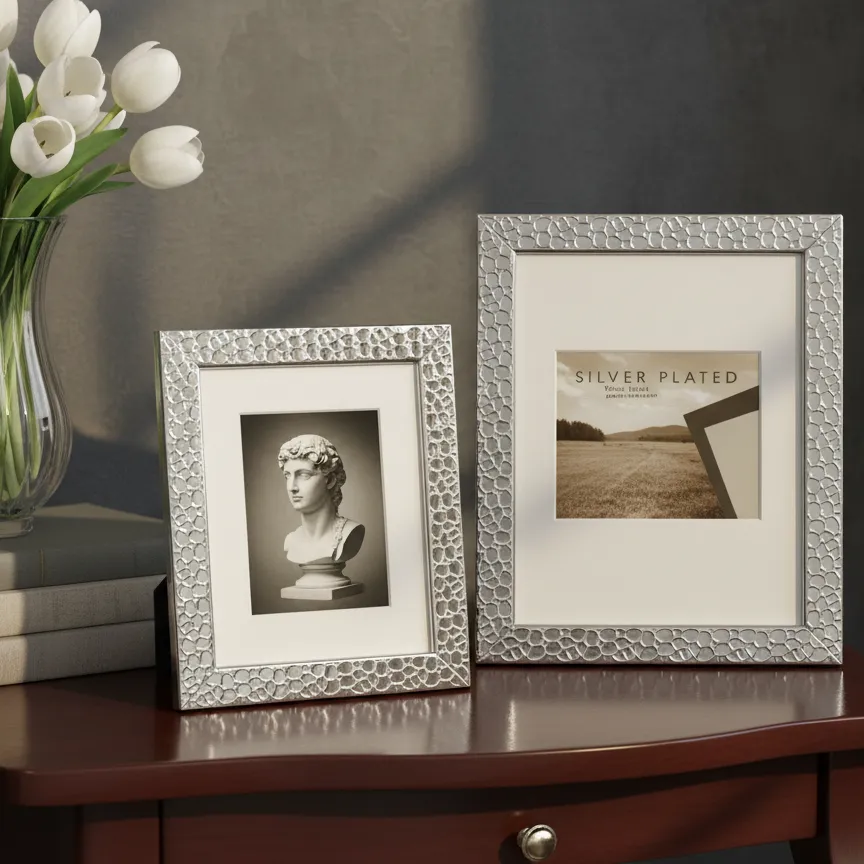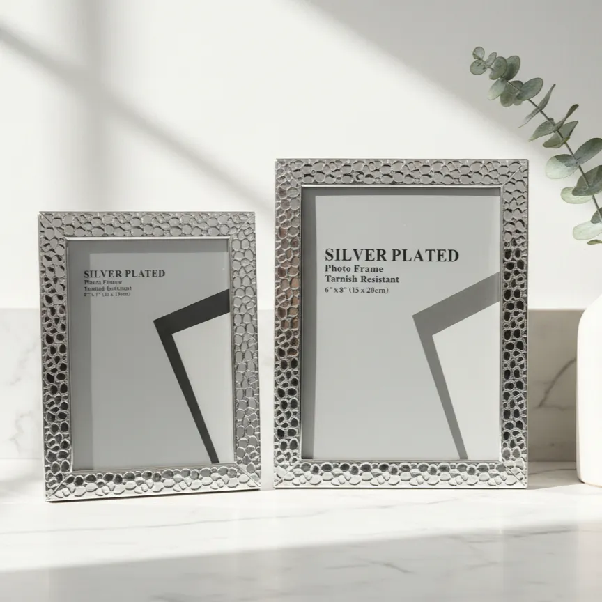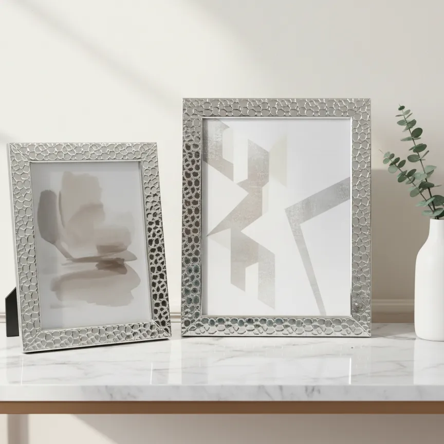The LuxeNova Silver Heritage Frames redefine elegance with their embossed metallic design and immaculate shine. Tarnish-resistant and expertly finished, they offer a high-end aesthetic that seamlessly complements luxury living spaces, delivering a perfect balance of sophistication and style.Presented are two exquisite silver-plated photo frames, boasting a tarnish-resistant finish for enduring brilliance. The smaller, ideal for intimate portraits, measures 5″ x 7″ (13 x 18cm), while its larger counterpart, perfect for showcasing grander memories, commands attention at 6″ x 8″ (15 x 20cm). Each frame features a delicately textured border, adding a touch of tactile luxury to its sleek, high-polish surface
