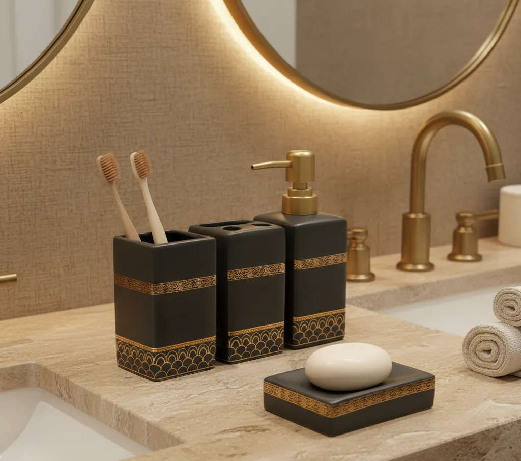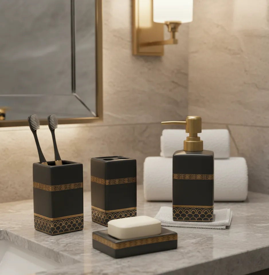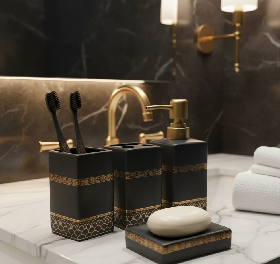 Obsidian Crown Bath Ensemble reflects modern royalty through its sleek silhouettes and sophisticated gold detailing. Designed to balance boldness with elegance, this collection delivers a timeless aesthetic that enhances luxury bathrooms with confidence and refinement.