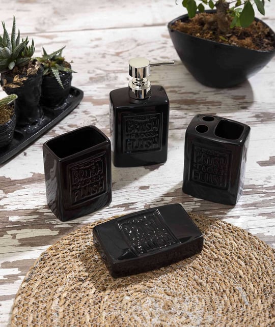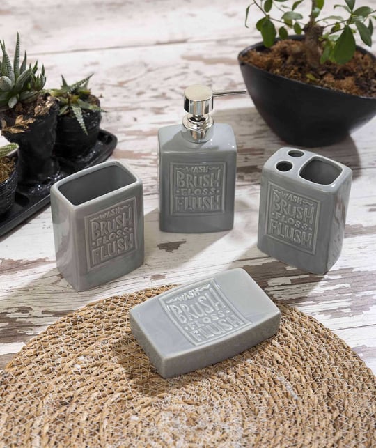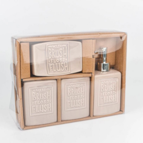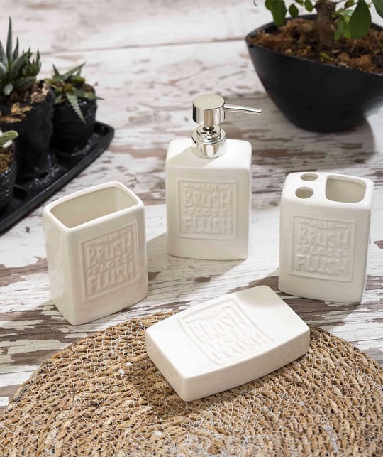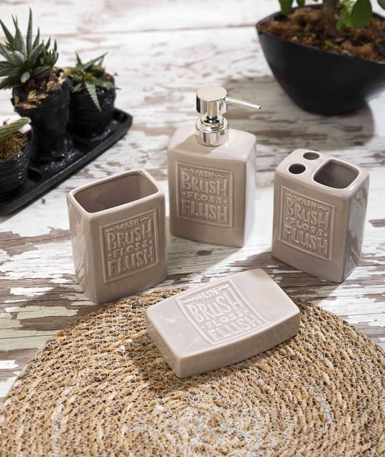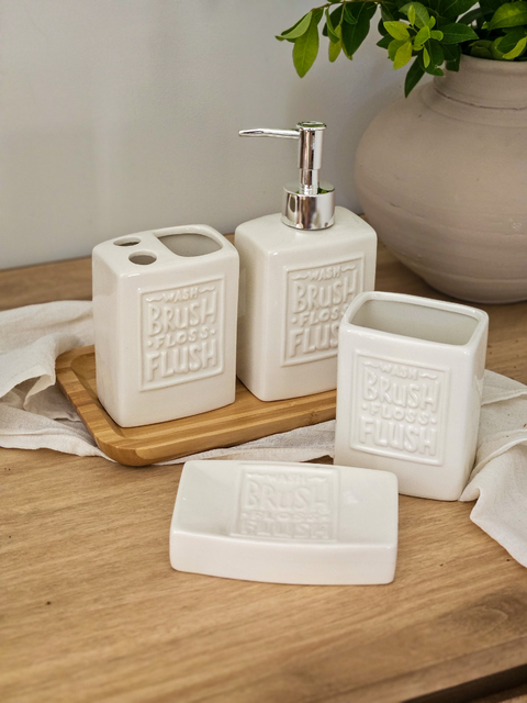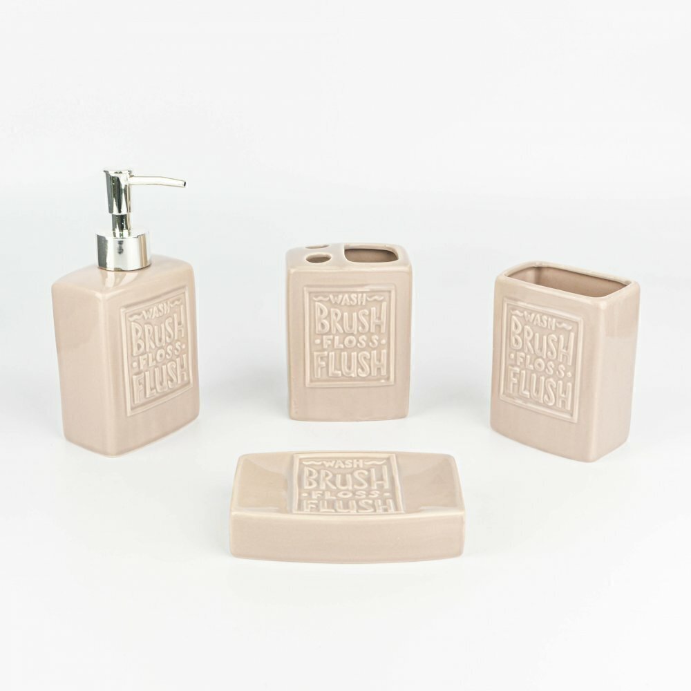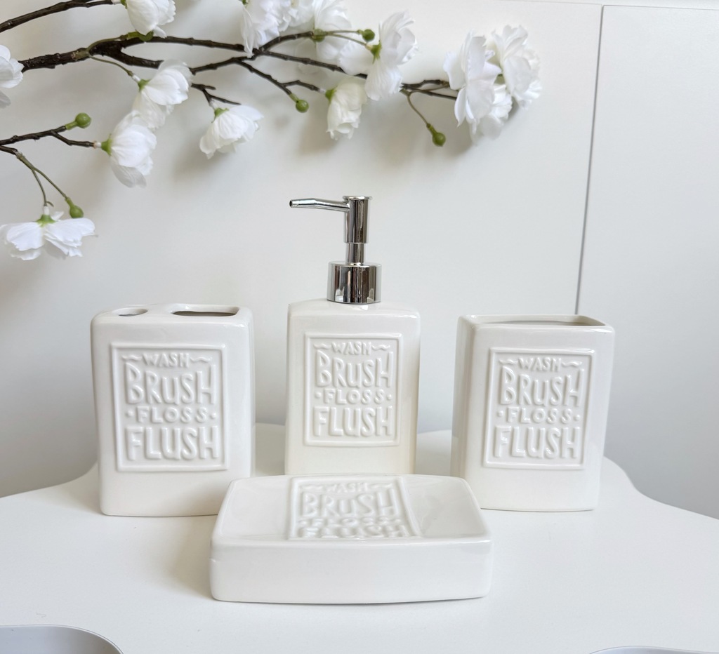 Add a touch of rustic charm to your bathroom with this elegant 4-piece vintage ceramic accessory set. Featuring a minimalist beige finish and embossed with the reminder to “Wash, Brush, Floss, Flush”, each piece blends functionality with timeless design. The set includes a soap dispenser with a chrome pump, a toothbrush holder with dual slots, a tumbler, and a soap dish. Perfect for farmhouse, shabby chic, or modern rustic interiors, this durable and easy-to-clean set helps keep your bathroom essentials stylishly organized.
