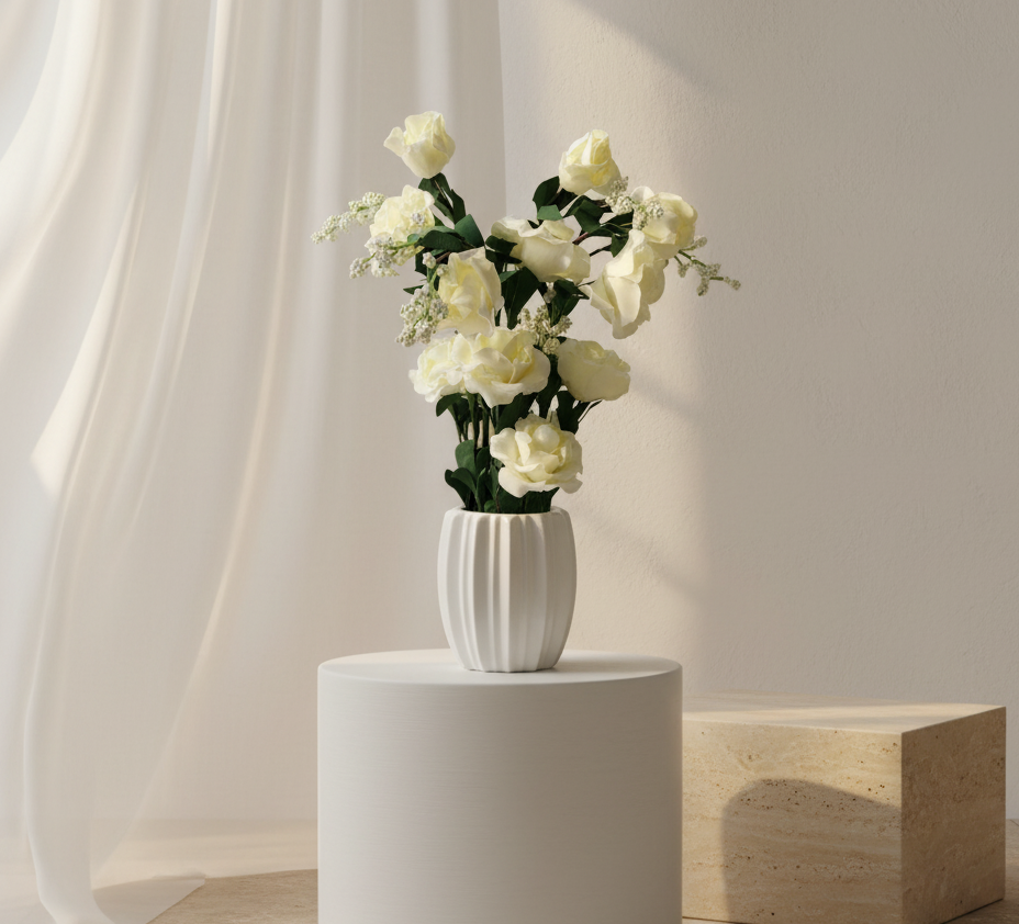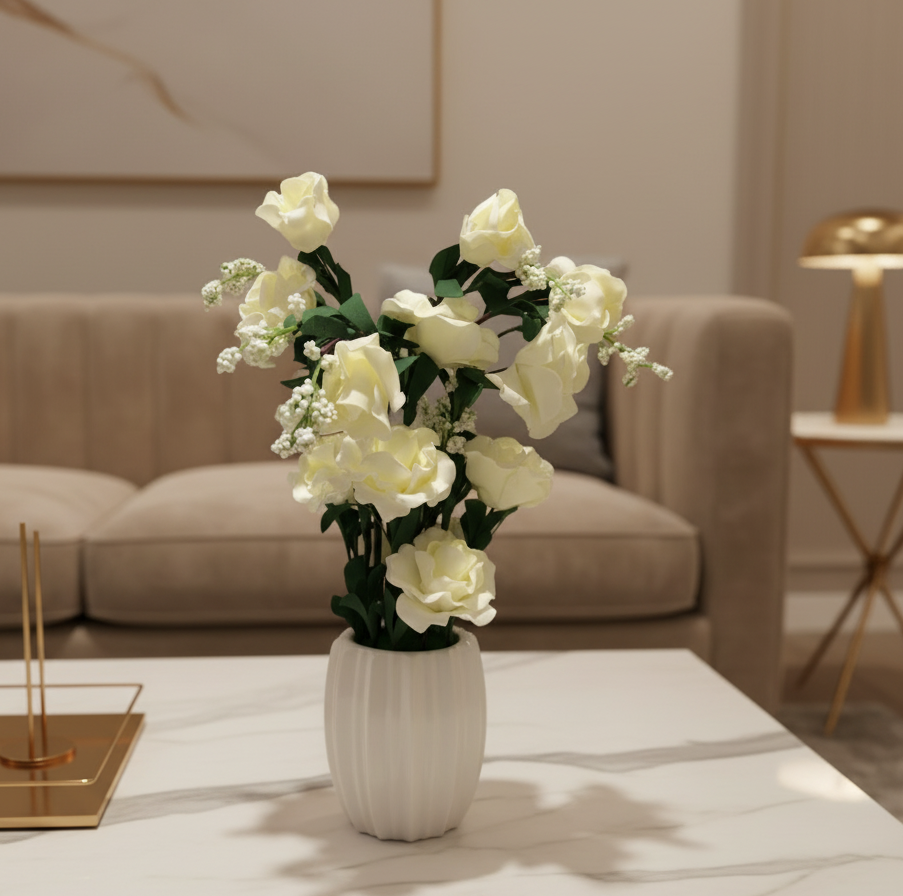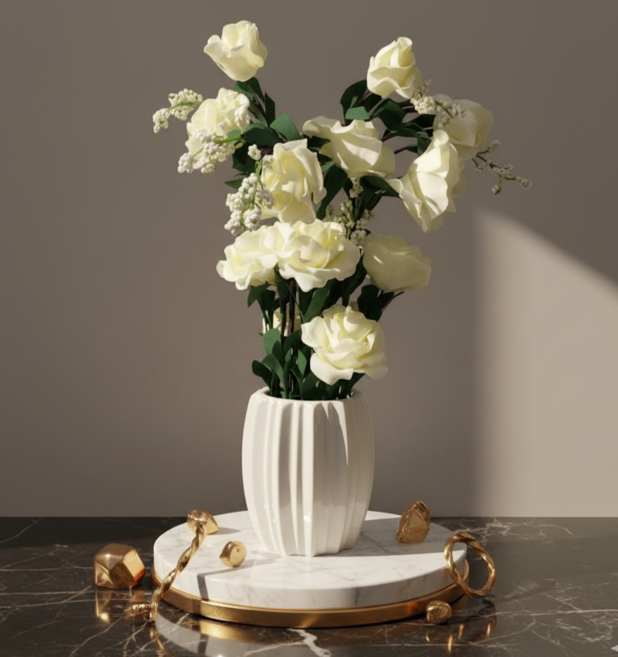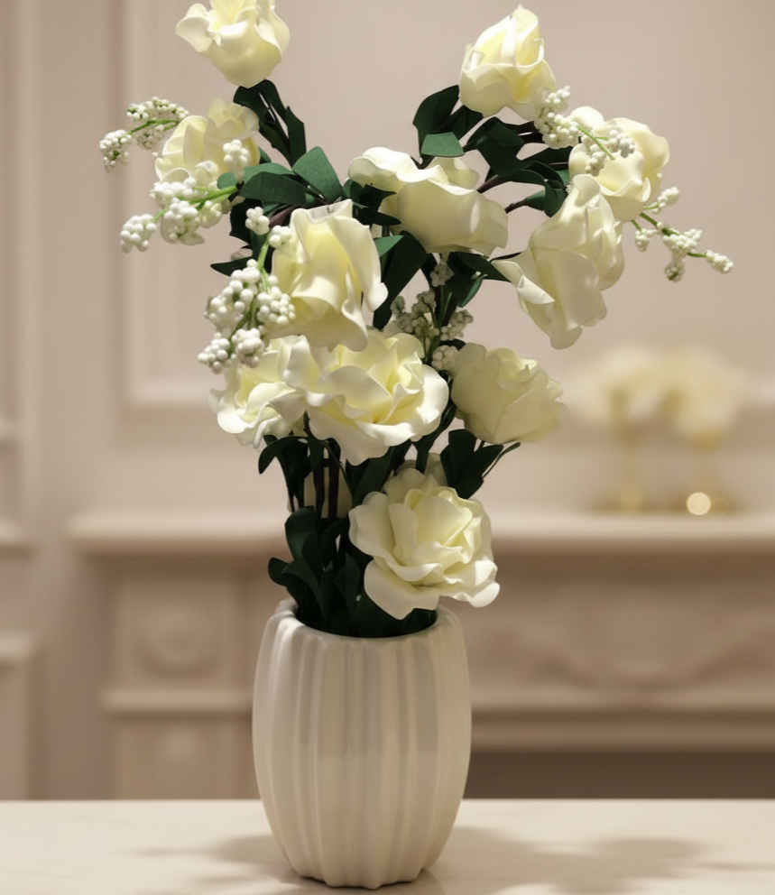 A sophisticated blend of soft ivory roses and pearlescent floral clusters, set in a beautiful vertically sculpted vase. The ensemble glows with understated elegance, perfect for premium décor styling and artistic displays.