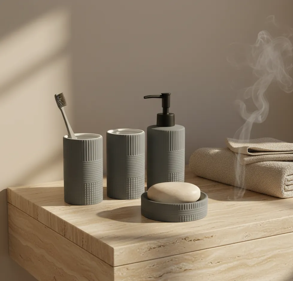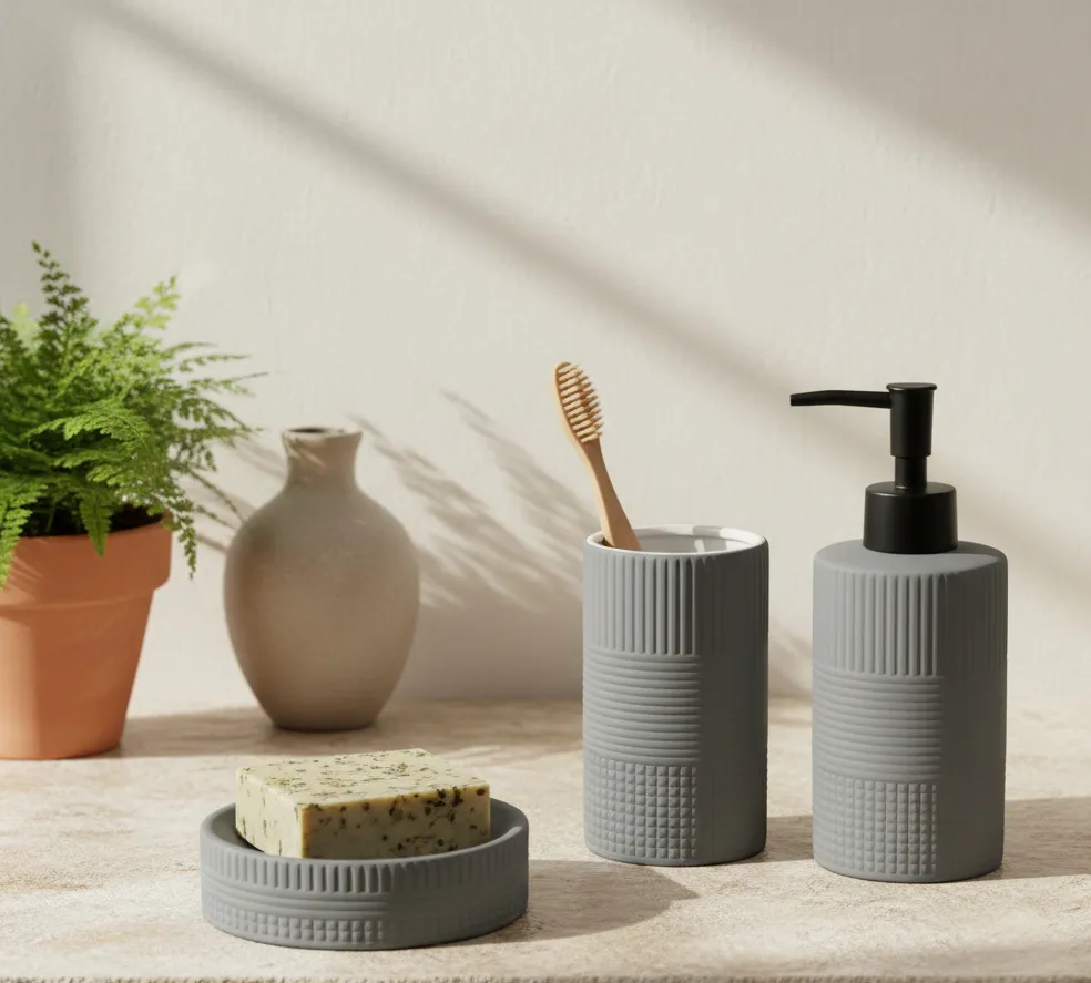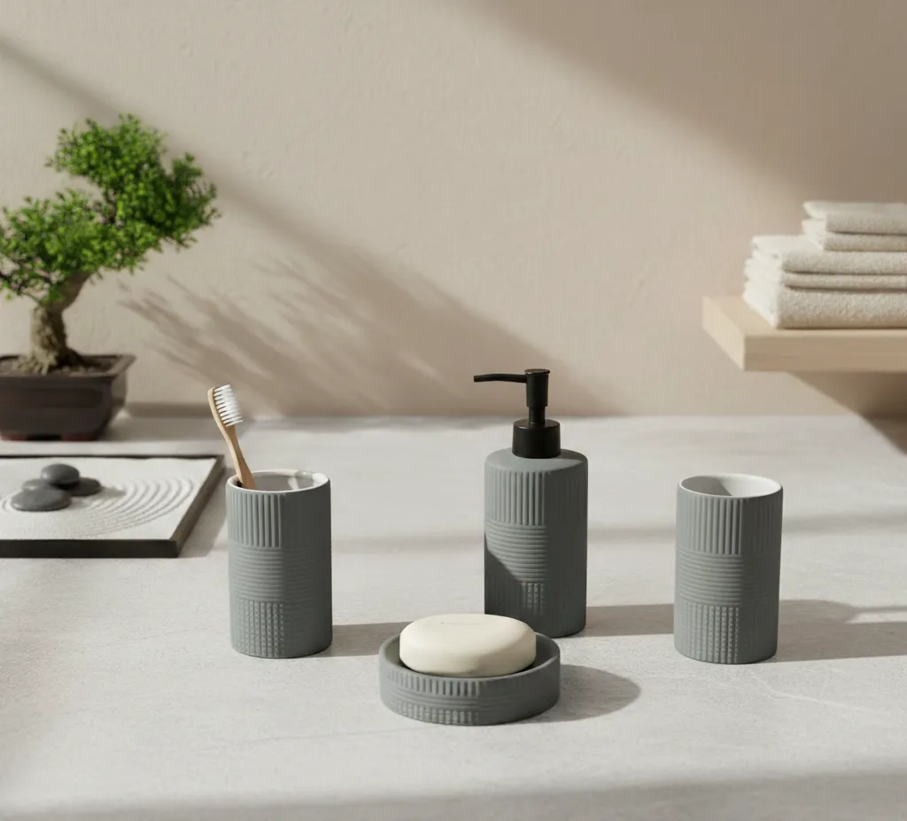 • Includes soap dispenser, toothbrush holder, tumbler & soap dish
