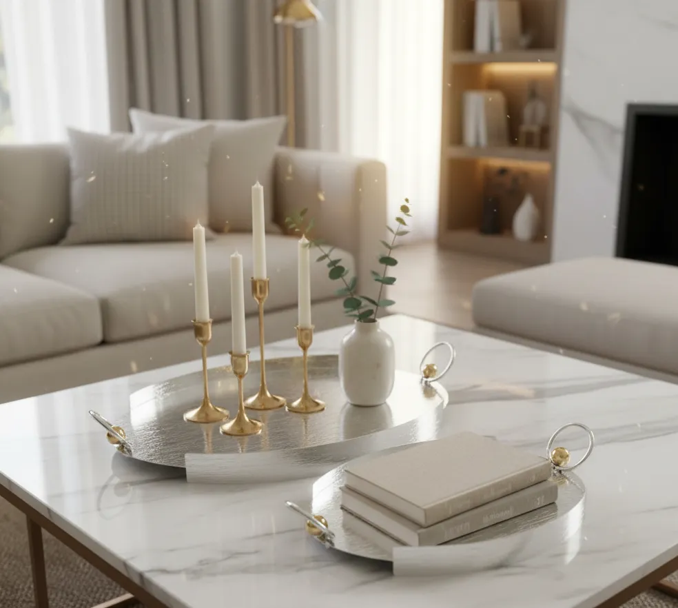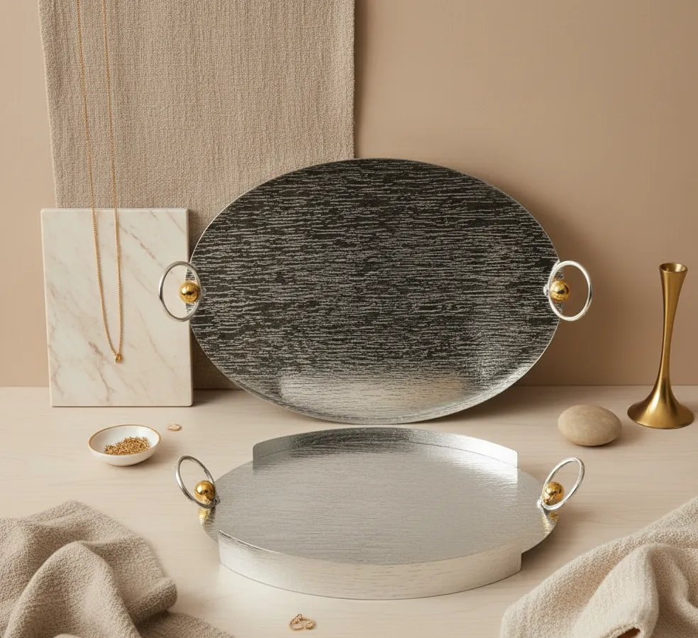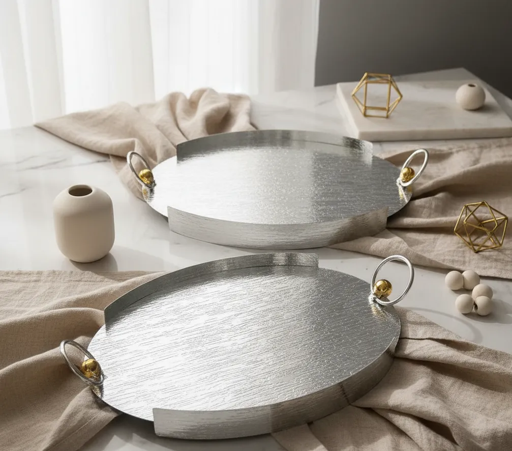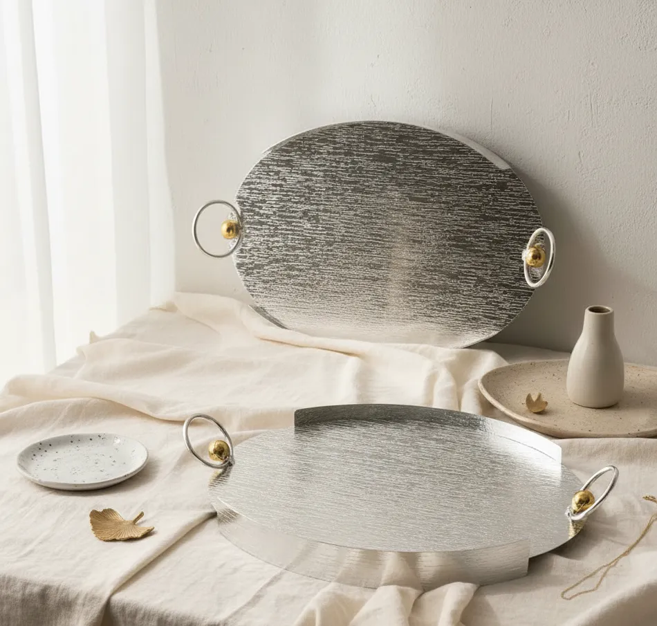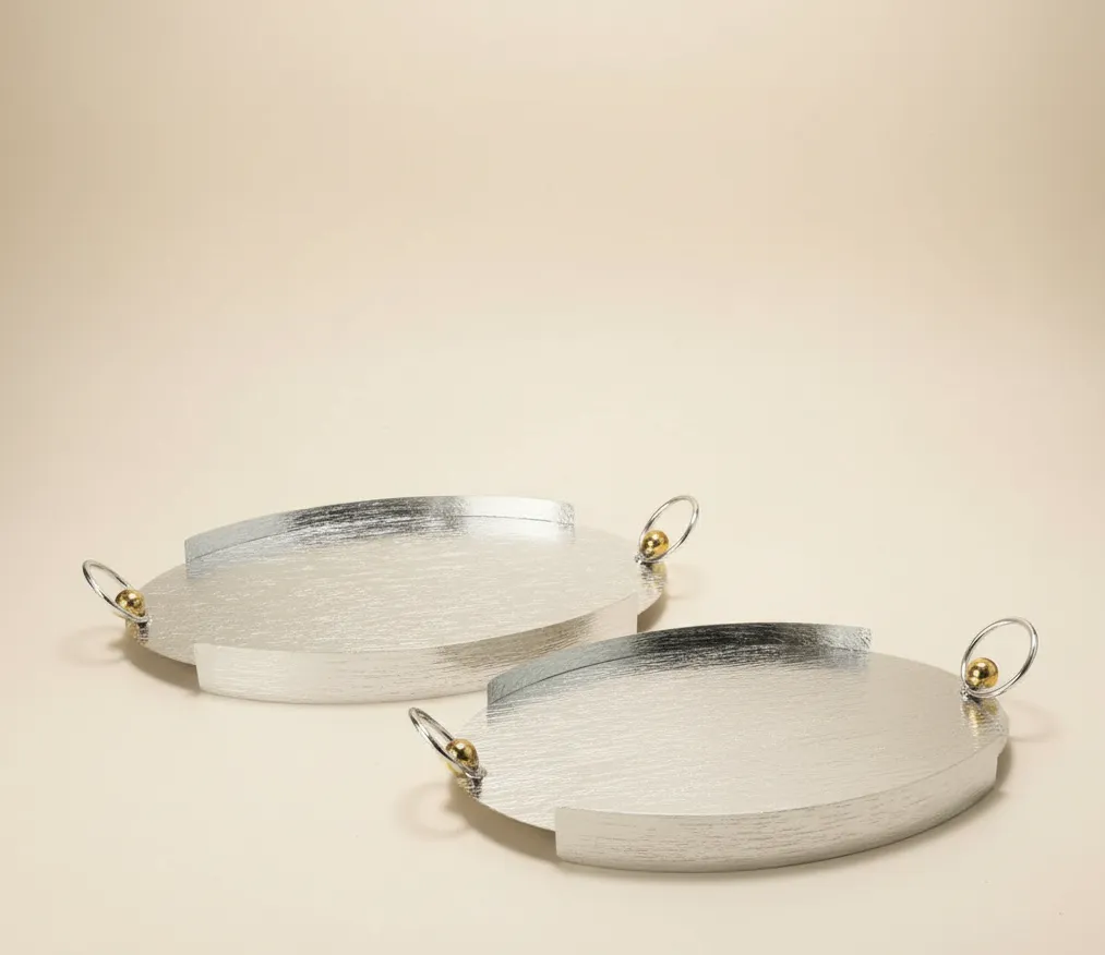 A refined expression of modern luxury, this dual tray set blends brushed silver textures with delicate gold-accent handles, perfect for sophisticated serving and décor styling.