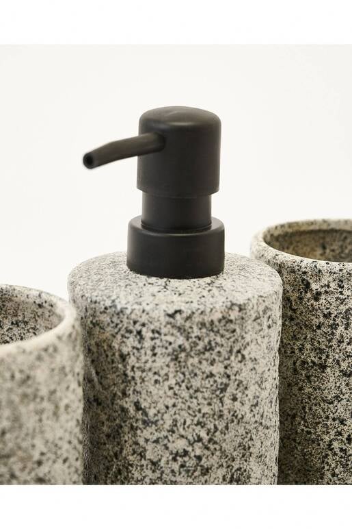 Liquid Soap Dispenser: A tall, rectangular-shaped dispenser with a black pump mechanism at the top.