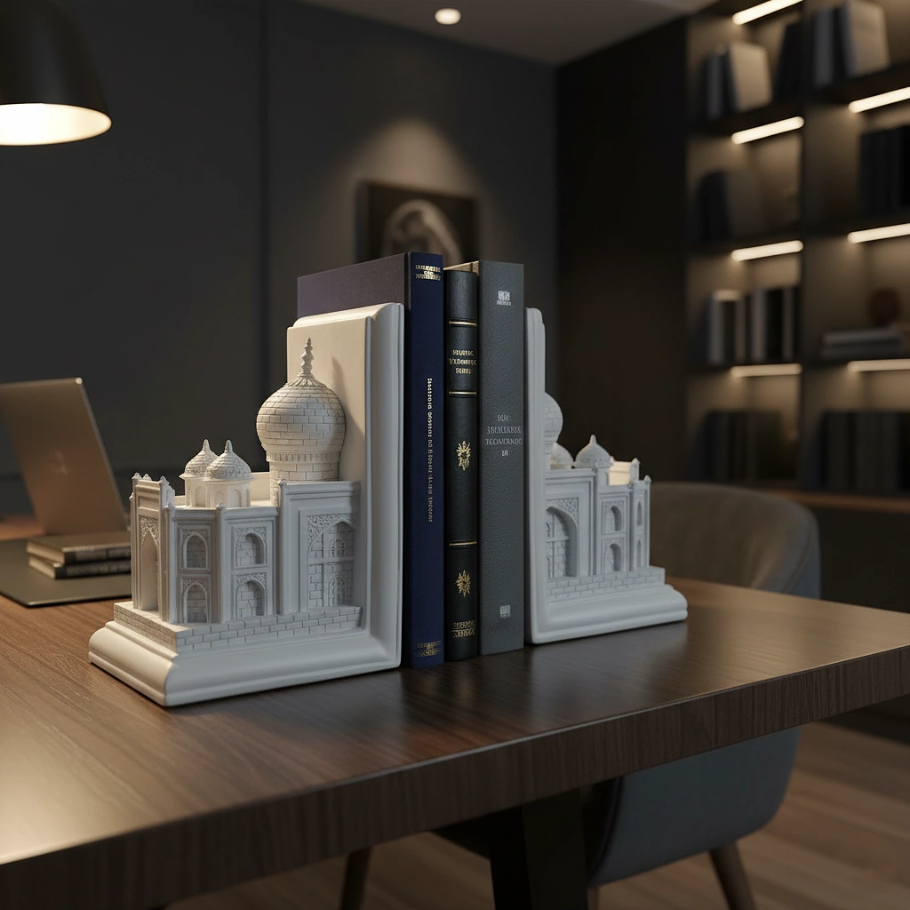 Bring the grandeur of a World Wonder to your bookshelf with The “Taj Imperial” Alabaster Series. This breathtaking pair of bookends is a tribute to the timeless beauty of Mughal architecture, perfectly capturing the silhouette of the world’s most famous monument to love.