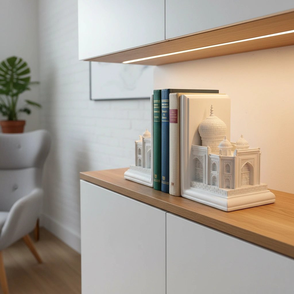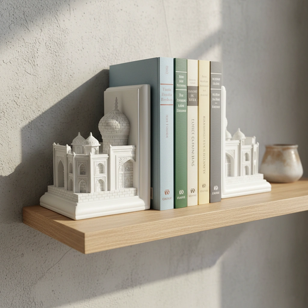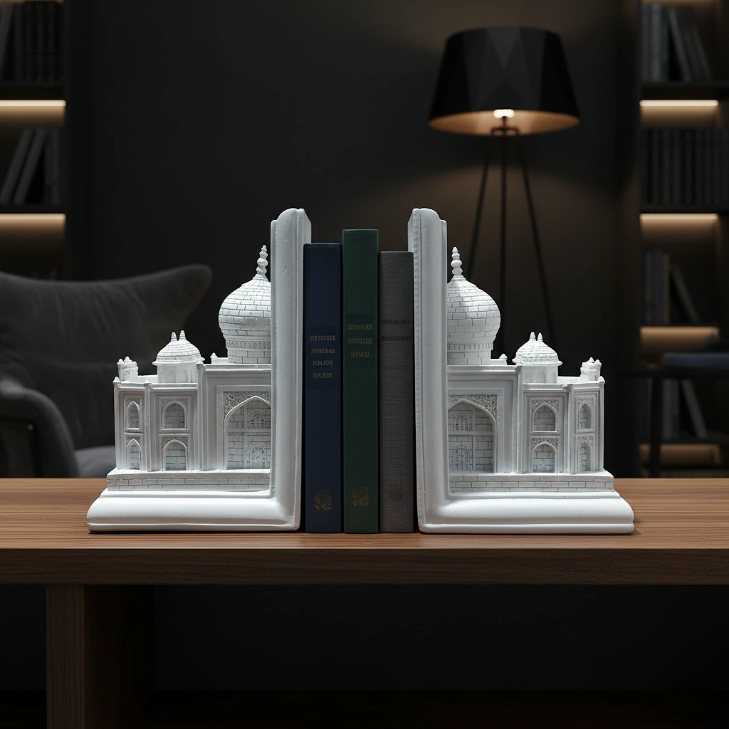 Finished in a pristine, matte white that mimics the coolness of Makrana marble, each piece showcases intricate relief work—from the iconic onion domes and finials to the delicate arched alcoves and brick detailing. When placed together, they form a miniature facade of the Taj Mahal; when separated, they act as majestic pillars supporting your literary collection.