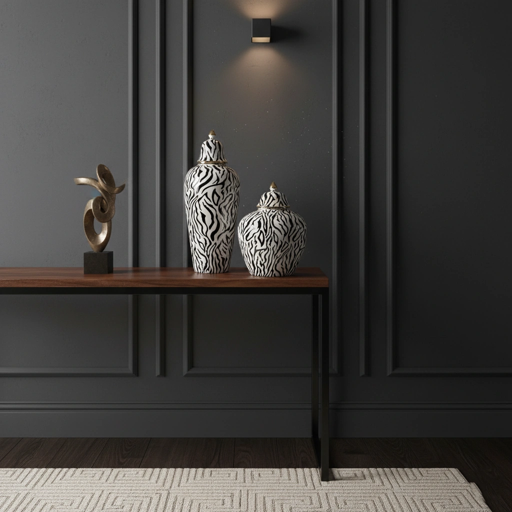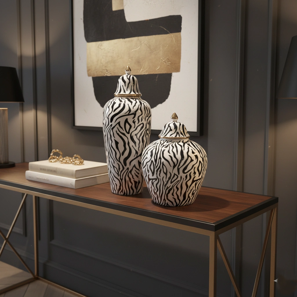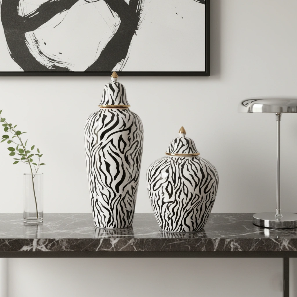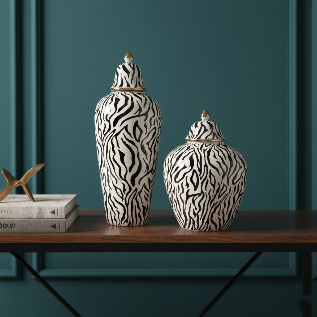 Unleash a touch of wild, untamed elegance with these striking statement pieces. Offering a glamorous take on classic safari chic, these exquisite temple jars feature a dynamic, organically flowing black zebra-stripe motif set against a pristine, glossy white porcelain backdrop. The bold, high-contrast pattern is beautifully elevated by opulent gold-finished accents, including a gleaming rim and a sculptural, pointed finial crowning each lid. Available in gracefully contrasting tall and stout silhouettes, this captivating duo is perfectly designed to bring a chic, maximalist edge to a luxurious marble console, a modern entryway, or a curated vanity display.