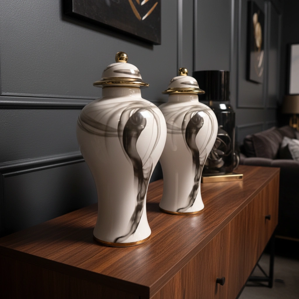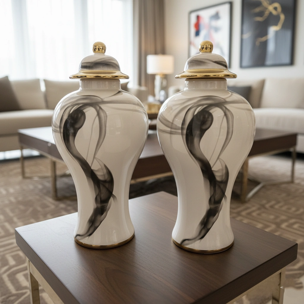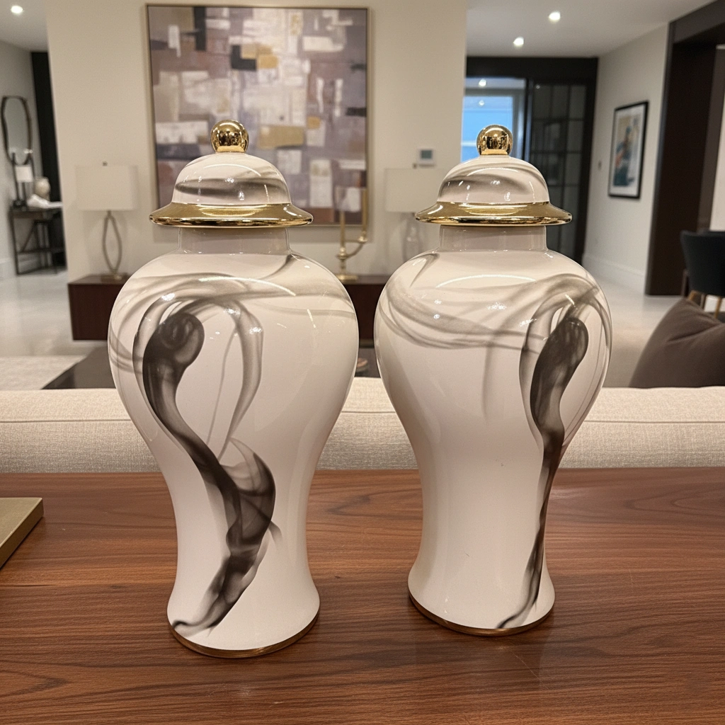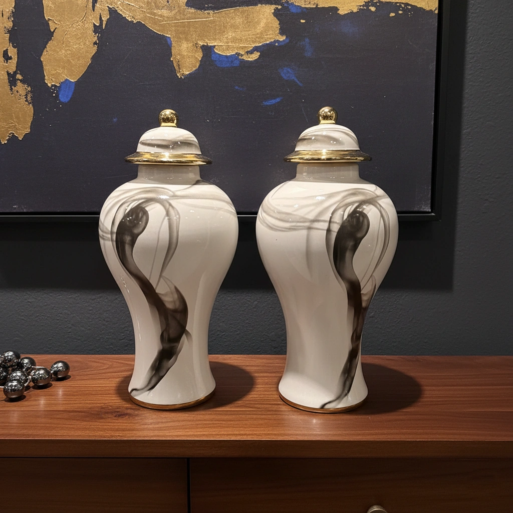 Infuse your interiors with a sense of serene, fluid movement. These exquisite porcelain temple jars feature a pristine white glazed finish, serving as the perfect canvas for a mesmerizing, abstract motif reminiscent of drifting dark smoke or delicate ink wash art. Hand-finished with opulent gold accents along the base, collar, and elegant lid finial, these contemporary vessels beautifully bridge the gap between classic silhouettes and modern artistry. Display them as a striking pair on a sleek console, a curated coffee table, or a sophisticated mantel to bring an elevated, gallery-worthy aesthetic to your living space.