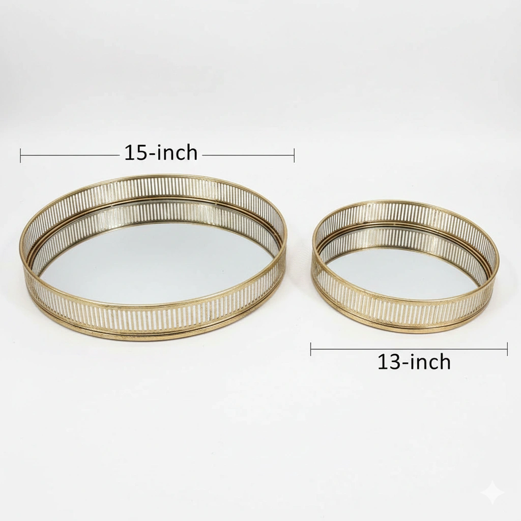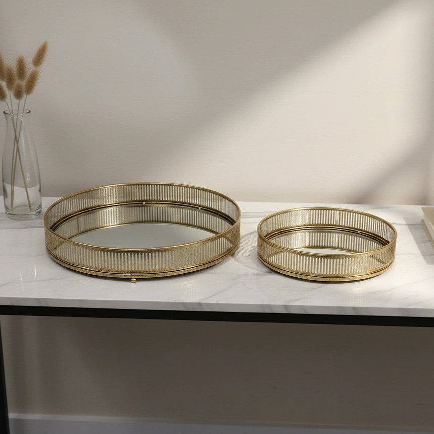 The standout feature of the Valery set is its striking vertical-ribbed gallery wall. This linear openwork creates a rhythmic visual flow that captures the light and casts elongated, elegant shadows. Finished in a rich, hand-applied burnished gold, the trays possess a soft, lived-in luster that radiates warmth and luxury. The floor of each tray is crafted from high-clarity mirrored glass, providing a brilliant reflective surface that adds depth to your displays and elevates the presence of your most cherished items.
