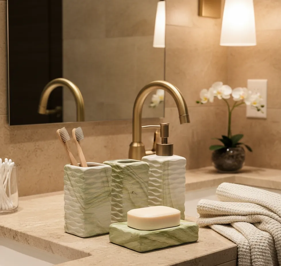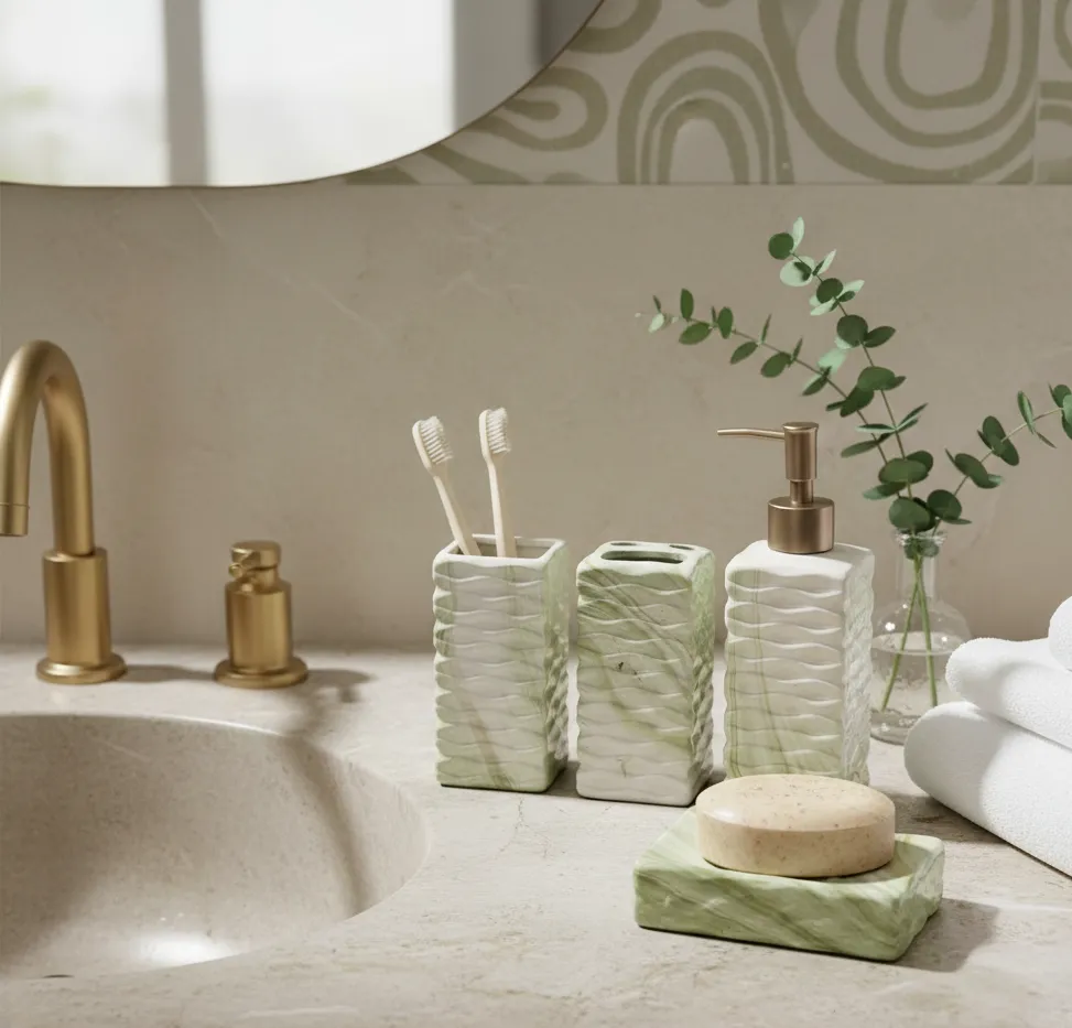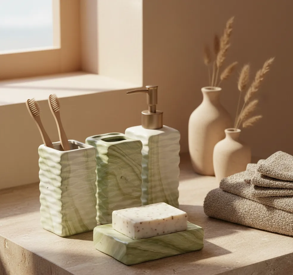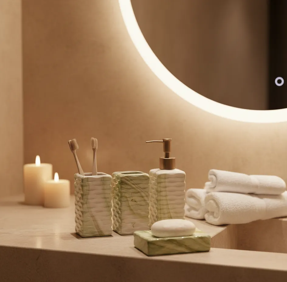 Inspired by the calming beauty of natural green onyx, the Verde Onyx Serenity Bath Collection brings a sense of balance and renewal to refined bathroom spaces. Soft wave textures and fluid stone veining create a sculptural elegance that transforms everyday rituals into spa-like moments of tranquility.