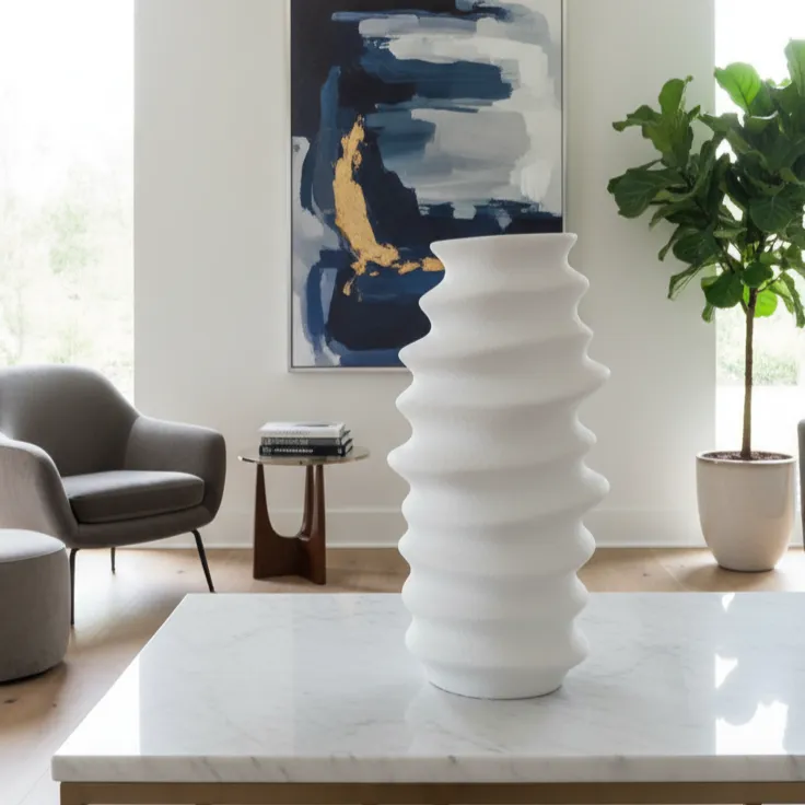 The White Ripple Sculptural Vase Set features a bold, contemporary design inspired by organic wave formations. Crafted in a matte, stone-like textured finish, each vase showcases smooth rhythmic curves that create a stunning play of light and shadow. Their sculptural silhouette makes them a standout accent piece—perfect for modern living rooms, consoles, dining tables, or minimalist decor settings.
